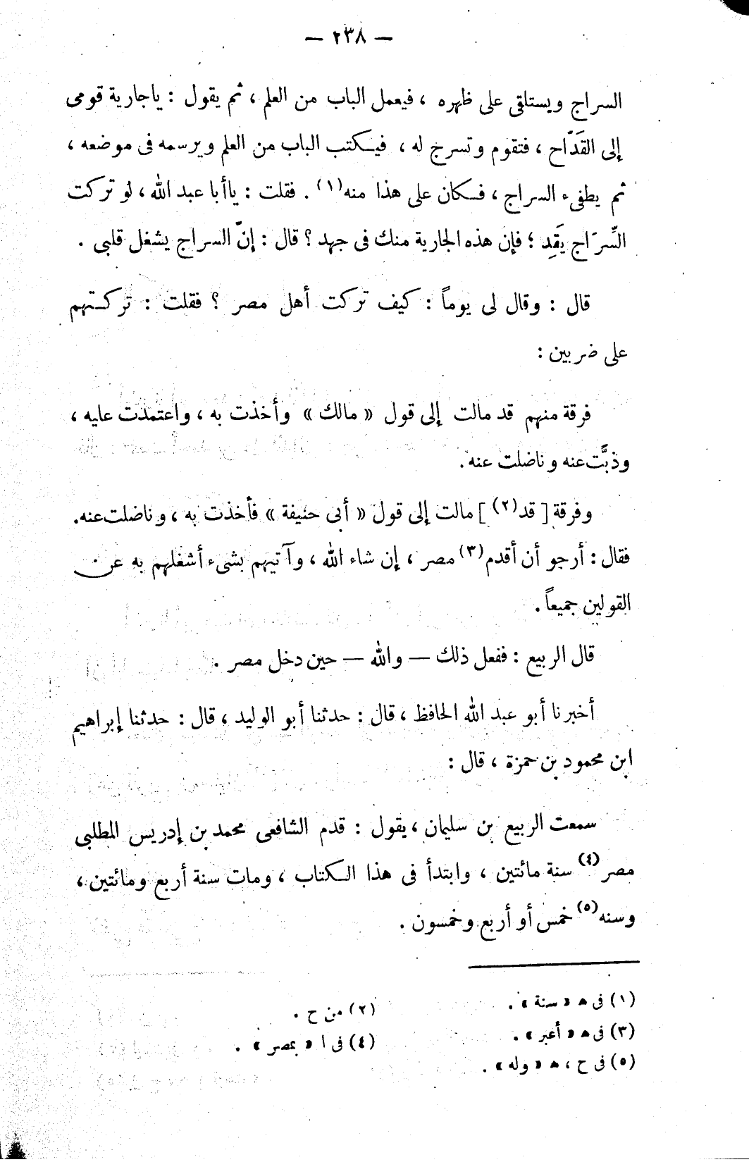 سمعت الربيع بن سليمان، يقول: قدم الشافعي محمد بن إدريس المطلبي مصر (٤) سنة مائتين، وابتدأ في هذا الكتاب، ومات سنة أربع ومائتين، وسنه (٥) خمس أو أربع وخمسون.