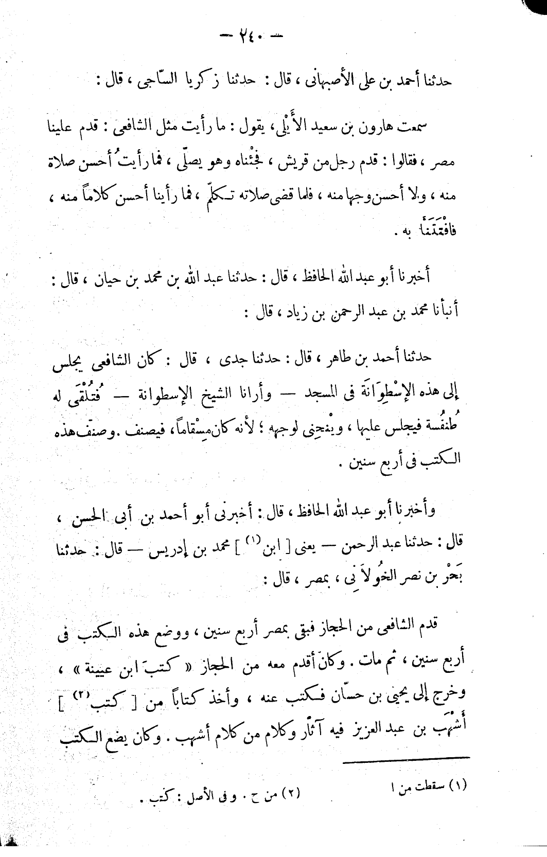 قدم الشافعي من الحجاز فبقى بمصر أربع سنين، ووضع هذه الكتب في أربع سنين، ثم مات. وكان أقدم معه من الحجاز «كتبَ ابن عيينة»، وخرج إلى يحيى بن حسّان فكتب عنه، وأخذ كتاباً من [كتب (٢)] أَشْهَب بن عبد العزيز فيه آثار وكلام من كلام أشهب. وكان يضع الكتب