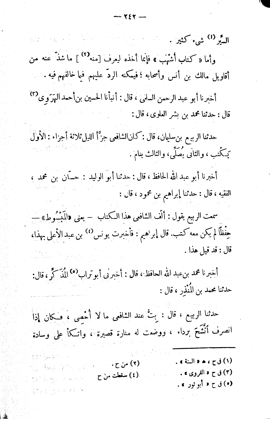 سمعت الربيع يقول: ألّف الشافعي هذا الكتاب - يعني «المَبْسُوط» - حِفْظاً لم يكن معه كتب. قال إبراهيم: فأخبرت يونس (٤) بن عبد الأعلى بهذا، قال: قد قيل هذا.