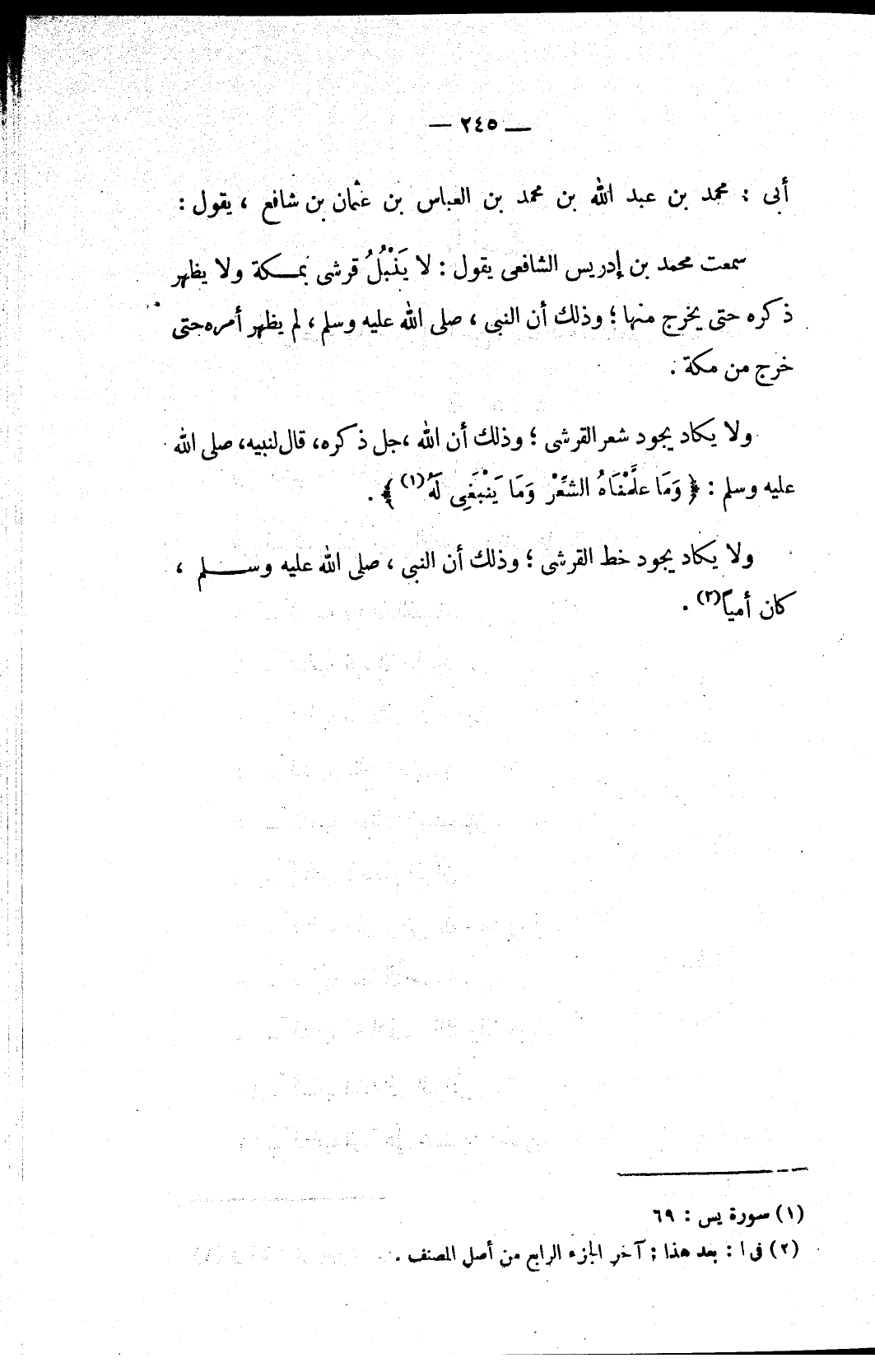 سمعت محمد بن إدريس الشافعي يقول: لا يَنْبُلُ قرشي بمكة ولا يظهر ذكره حتى يخرج منها؛ وذلك أن النبي، صلى الله عليه وسلم، لم يظهر أمره حتى خرج من مكة.