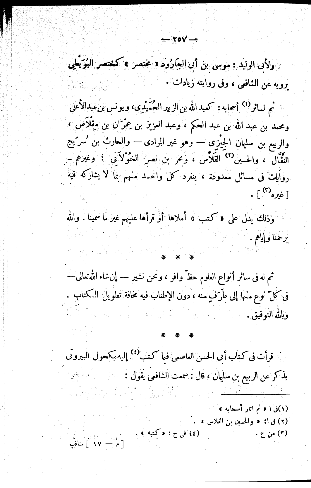 ثم لسائر (١) أصحابه: كعبد الله بن الزبير الحُمَيْدِي، ويونس بن عبد الأعلى ومحمد بن عبد الله بن عبد الحكم، وعبد العزيز بن عِمْرَان بن مِقْلاَص، والربيع بن سليمان الجِيْزِي - وهو غير المرادي - والحارث بن سُرَيج النَّقَّال، والحسين (٢) القَلاَّس، وبحر بن نصر الخُوْلاَنِي؛ وغيرهم - روايات في مسائل معدودة، ينفرد كل واحد منهم بما لا يشاركه فيه [غيره (٣)].