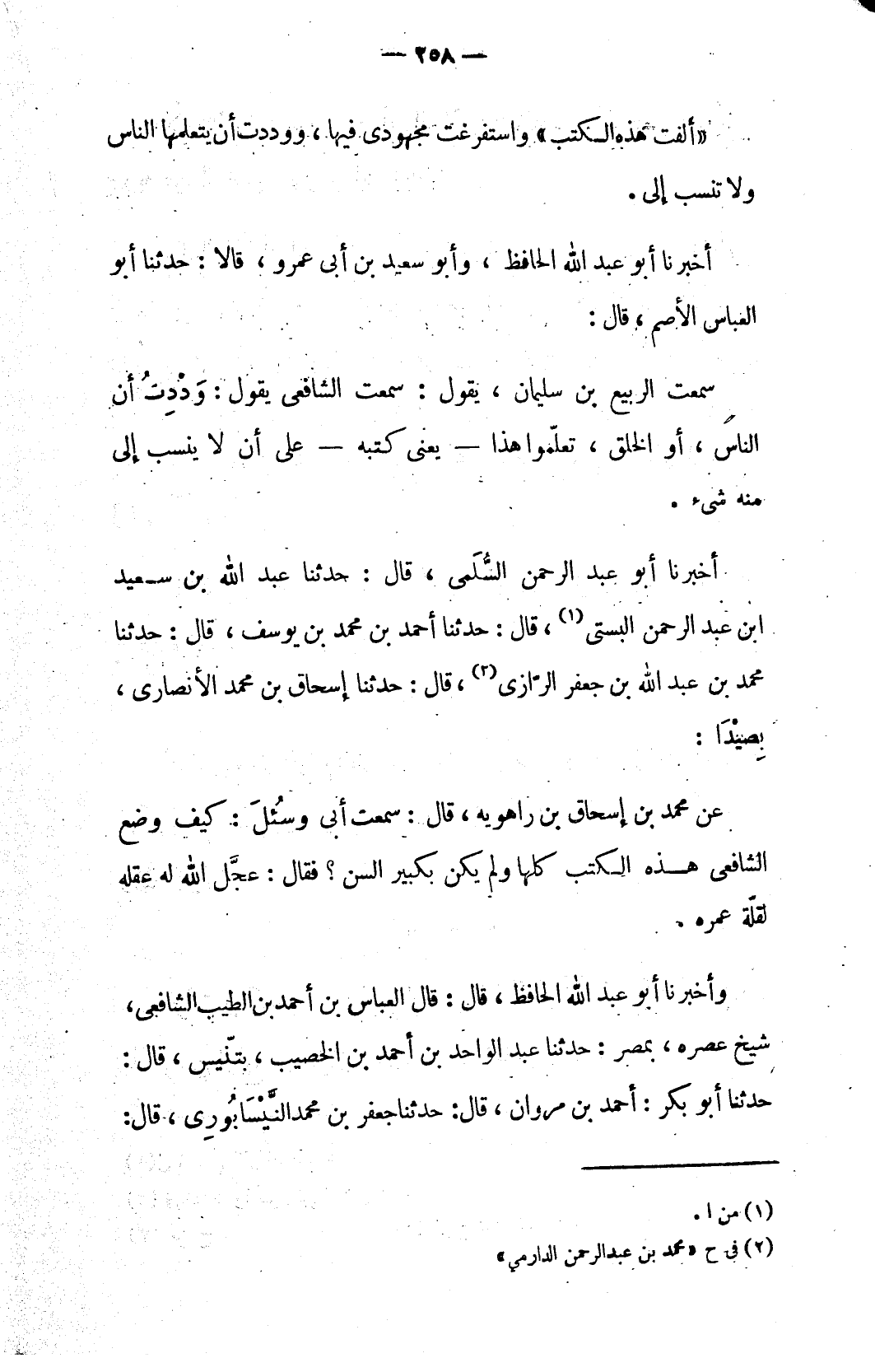 سمعت الربيع بن سليمان، يقول: سمعت الشافعي يقول: وَدْدِتُ أن الناس، أو الخلق، تعلّموا هذا - يعني كتبه - على أن لا ينسب إلي منه شيء.