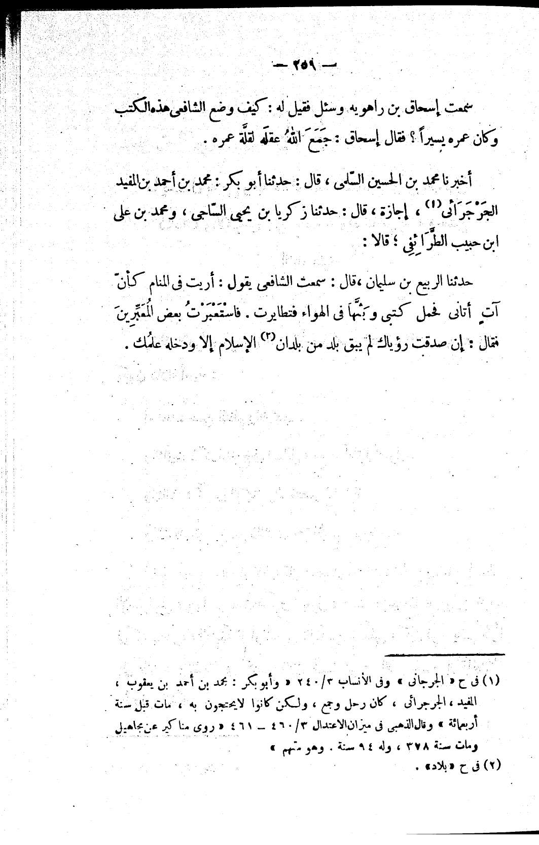 أخبرنا محمد بن الحسين السّلمي، قال: حدثنا أبو بكر: محمد بن أحمد بن المفيد الجَرْجَرَائي (١)، إجازة، قال: حدثنا زكريا بن يحيى السّاجي، ومحمد بن علي ابن حبيب الطَّرَائِفِي؛ قال: