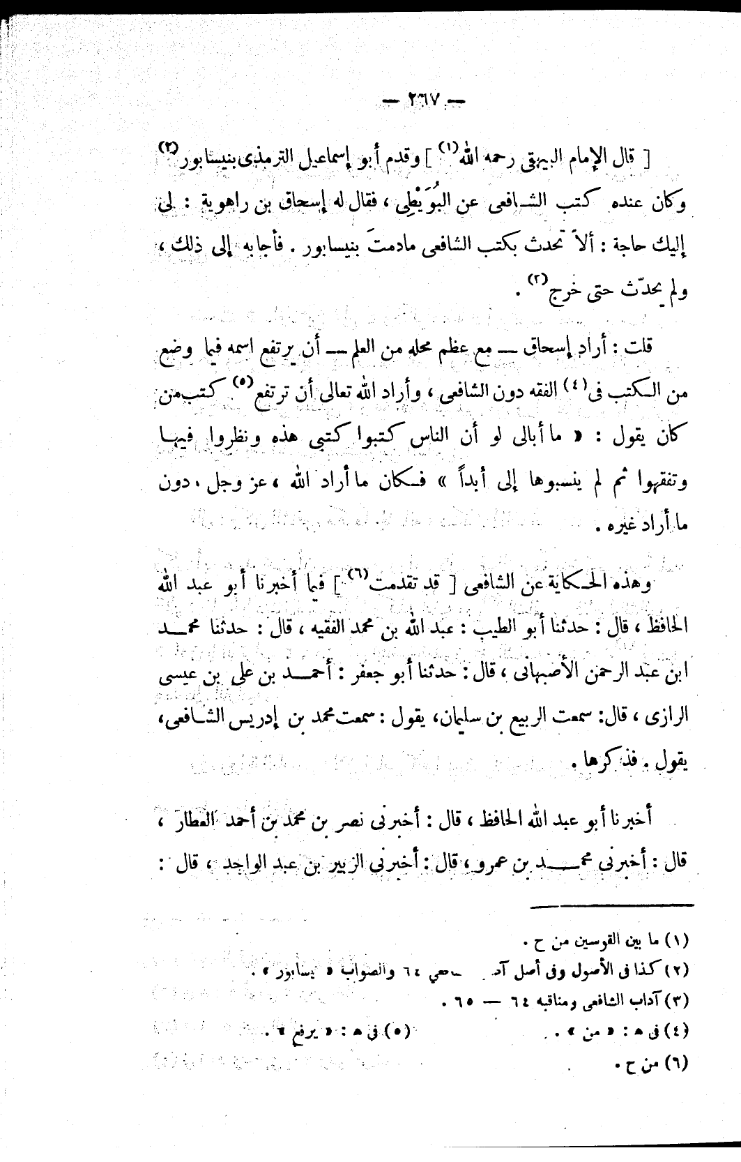 قلت: أراد إسحاق – مع عظم محله من العلم – أن يرتفع اسمه فيما وضع من الكتب في (٤) الفقه دون الشافعي، وأراد الله تعالى أن ترتفع (٥) كتب من كان يقول: «ما أبالي لو أن الناس كتبوا كتبي هذه ونظروا فيها وتفقهوا ثم لم ينسبوها إلي أبداً» فكان ما أراد الله، عز وجل، دون ما أراد غيره.