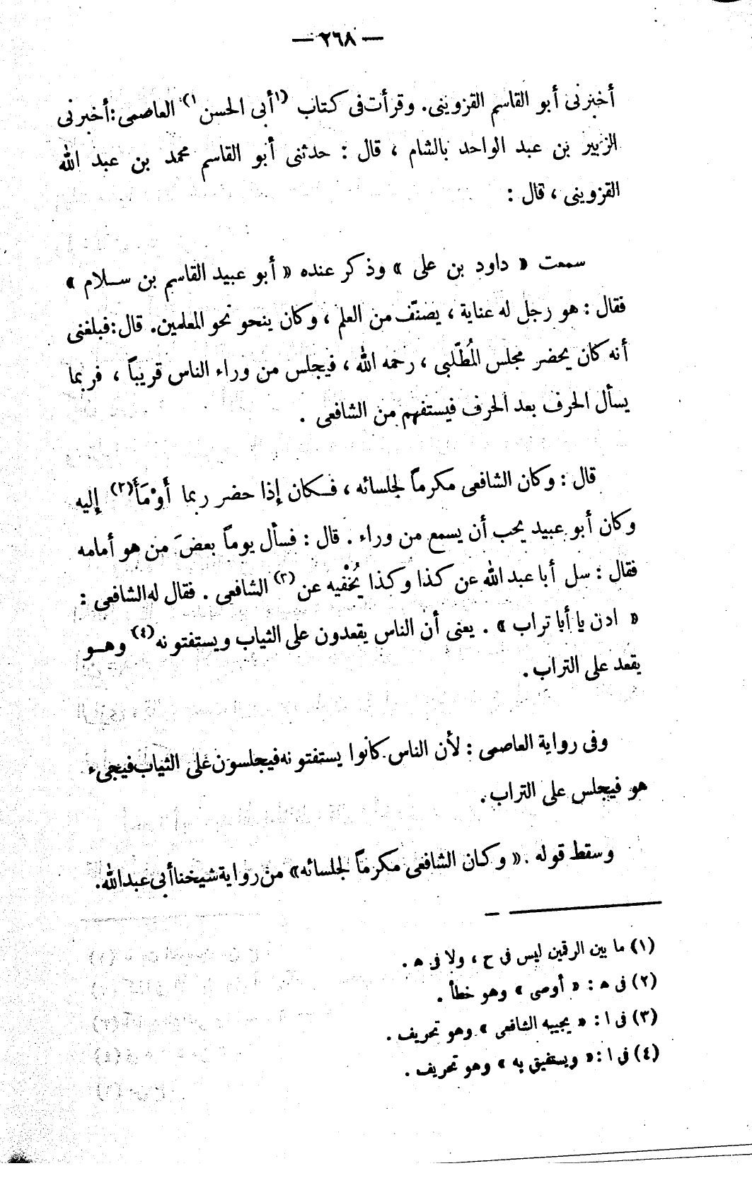 قال: وكان الشافعي مكرماً لجلسائه، فكان إذا حضر ربما أَوْمَاَ (٢) إليه وكان أبو عبيد يحب أن يسمع من وراء. قال: فسأل يوماً بعضَ من هو أمامه فقال: سل أبا عبد الله عن كذا وكذا يُخْفيه عن (٣) الشافعي. فقال له الشافعي: «ادن يا أبا تراب». يعني أن الناس يقعدون على الثياب ويستفتونه (٤) وهو يقعد على التراب.