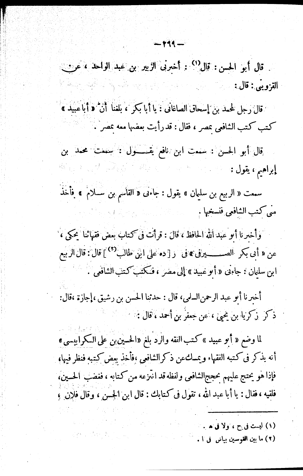 وأخبرنا أبو عبد الله الحافظ، قال: قرأت في كتاب بعض فقهائنا يحكي، عن «أبي بكر الصيرفي» في ر [ده على ابن أبي طالب (٢)] قال: قال الربيع ابن سليمان: جاءني «أبو عبيد» إلى مصر، فكتب كتب الشافعي.