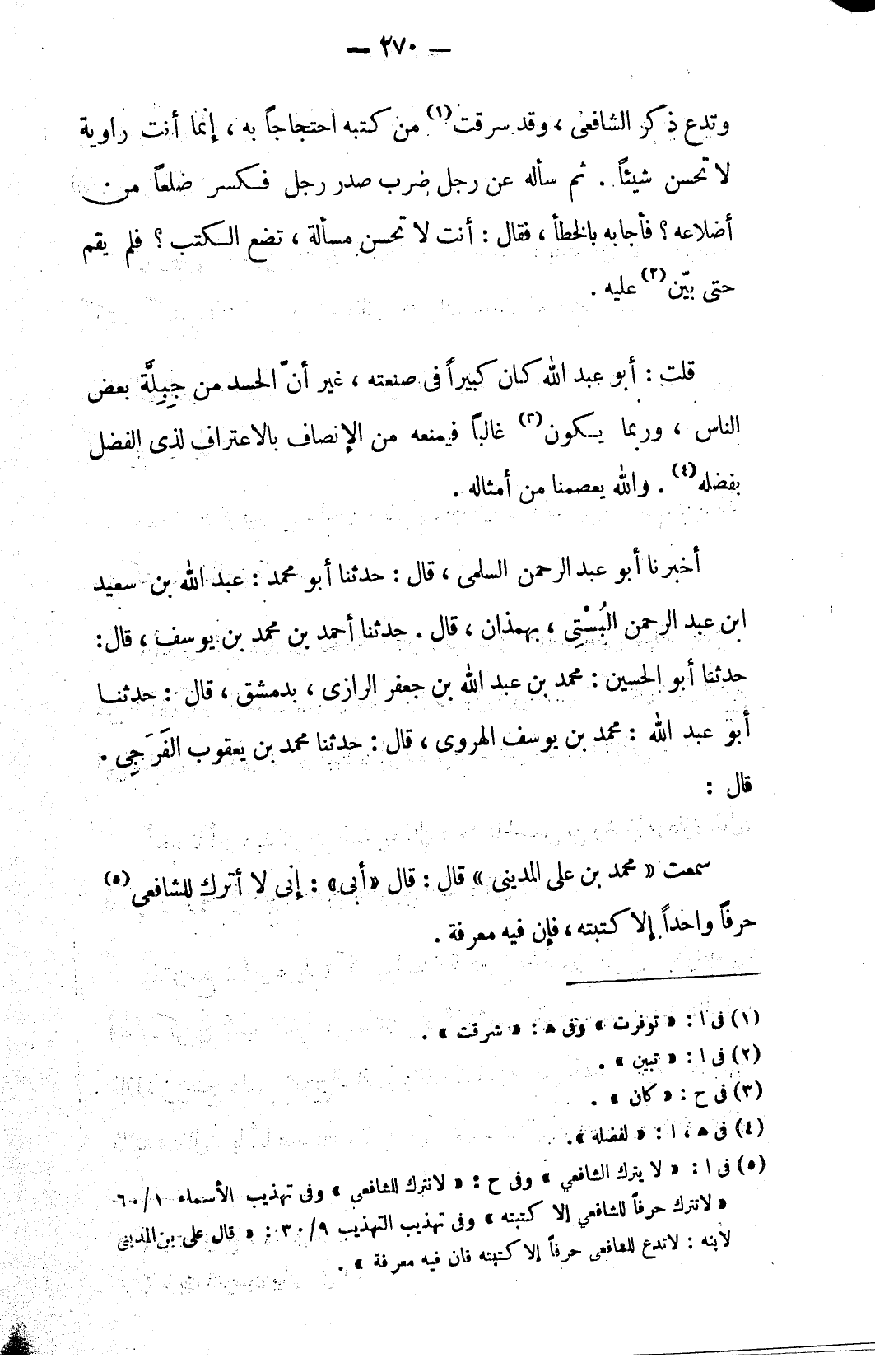 (٥) في ا: «لا يترك الشافعي» وفي ح: «لا نترك للشافعي» وفي تهذيب الأسماء ١/ ٦٠ «لا تترك حرفاً للشافعي إلا كتبته» وفي تهذيب التهذيب ٩/ ٣٠: «قال علي بن المديني لابنه: لا تدع للشافعي حرفاً إلا كتبته فان فيه معرفة».