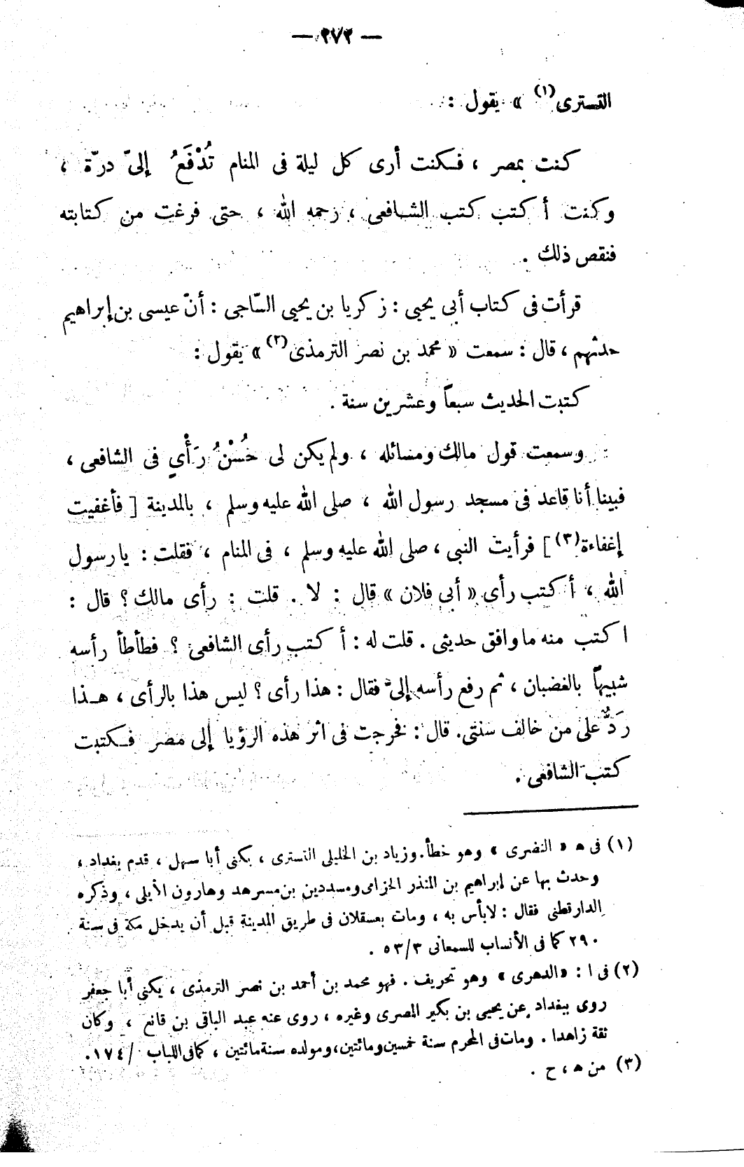 وسمعت قول مالك ومسائله، ولم يكن لي حُسْنُ رَايٍ في الشافعي، فبينا أنا قاعد في مسجد رسول الله، صلى الله عليه وسلم، بالمدينة [فأغفيت إغفاءة (٣)] فرأيت النبي، صلى الله عليه وسلم، في المنام، فقلت: يا رسول الله، أكتب رأي «أبي فلان» قال: لا. قلت: رأي مالك؟ قال: اكتب منه ما وافق حديثي. قلت له: أكتب رأي الشافعي؟ فطأطأ رأسه شبيهاً بالغضبان، ثم رفع رأسه إليّ فقال: هذا رأي؟ ليس هذا بالرأي، هذا رَدٌّ على من خالف سنتي. قال: فخرجت في اثر هذه الرؤيا إلى مصر فكتبت كتب الشافعي.