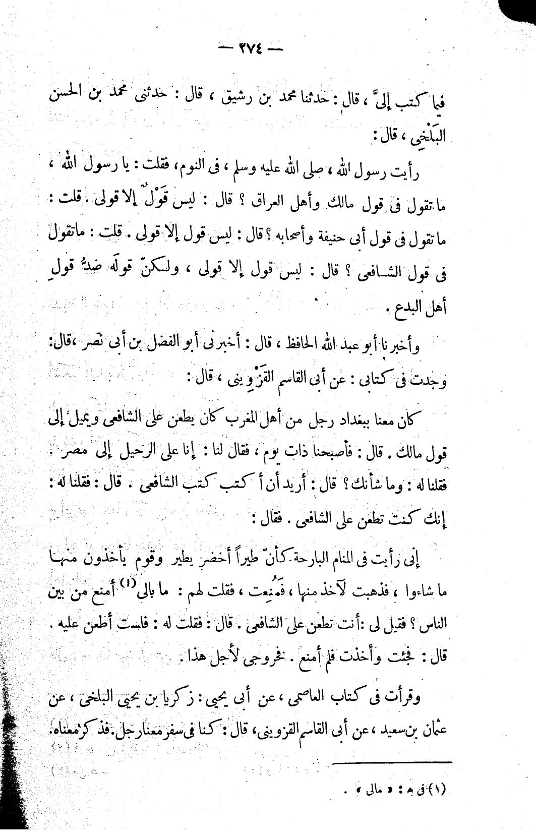 إني رأيت في المنام البارحة. كأنّ طيراً أخضر يطير وقوم يأخذون منها ما شاءوا، فذهبت لآخذ منها، فَمُنِعت، فقلت لهم: ما بالي (١) أمنع من بين الناس؟ فقيل لي: أنت تطعن على الشافعي. قال: فقلت له: فلست أطعن عليه. قال: فجئت وأخذت فلم أمنع. فخروجي لأجل هذا.
