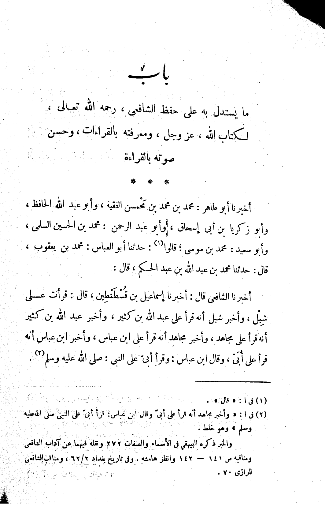 أخبرنا الشافعي قال: أخبرنا إسماعيل بن قُسْطَنْطِين، قال: قرأت على شِبْل، وأخبر شبل أنه قرأ على عبد الله بن كثير، وأخبر عبد الله بن كثير أنه قرأ على مجاهد، وأخبر مجاهد أنه قرأ على ابن عباس، وأخبر ابن عباس أنه قرأ على أُبَيّ، وقال ابن عباس: وقرأ أبي على النبي: صلى الله عليه وسلم (٢).