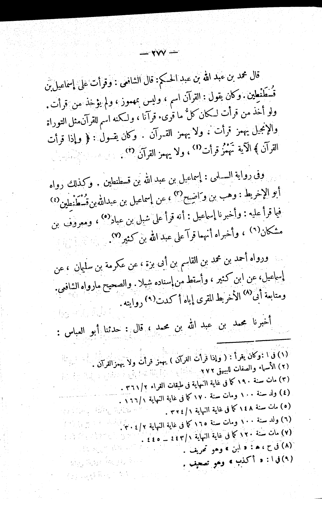 وفي رواية السلمي: إسماعيل بن عبد الله بن قسطنطين. وكذلك رواه أبو الإخريط: وهب بن وَاضِح (٣)، عن إسماعيل بن عبد الله بن قُسْطَنْطِين (٤) فيما قرأ عليه: وأخبرنا إسماعيل: أنه قرأ على شبل بن عباد (٥)، ومعروف بن مشكان (٦)، وأخبراه أنهما قرآ على عبد الله بن كثير (٧).