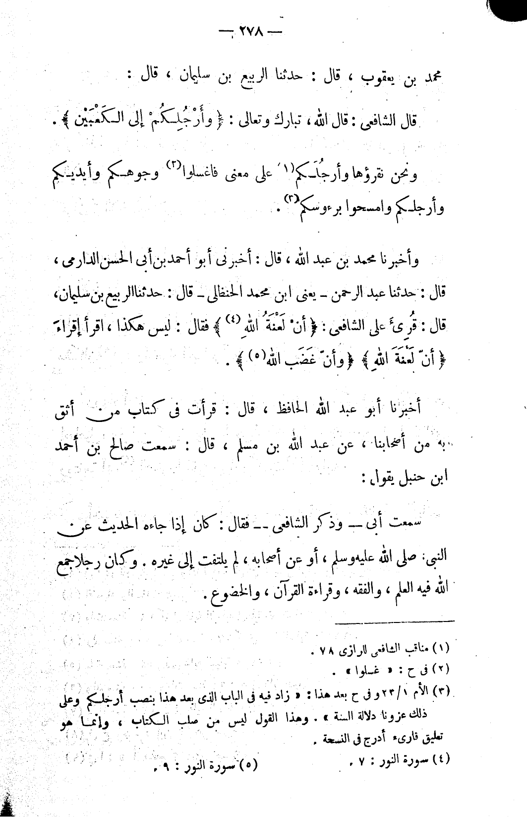 (٣) الأم ١/ ٢٣ وفي ح بعد هذا: «زاد فيه في الباب الذي بعد هذا بنصب أرجلكم وعلى ذلك عزونا دلالة السنة». وهذا القول ليس من صلب الكتاب، وإنما هو تعليق قارئ أدرج في النسحة.