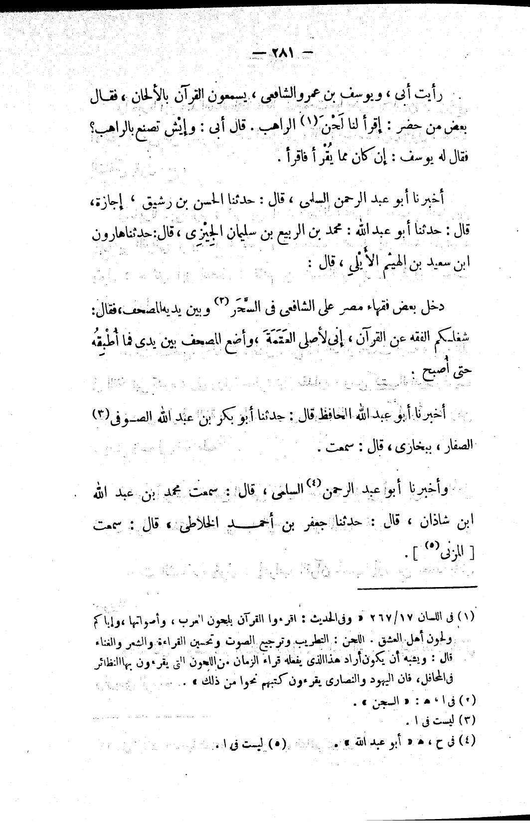 رأيت أبي، ويوسف بن عمرو الشافعي، يسمعون القرآن بالألحان، فقال بعض من حضر: إقرأ لنا لَحْنَ (١) الراهب. قال أبي: وإيْش تصنع بالراهب؟ فقال له يوسف: إن كان مما يُقْرأ فاقرأ.