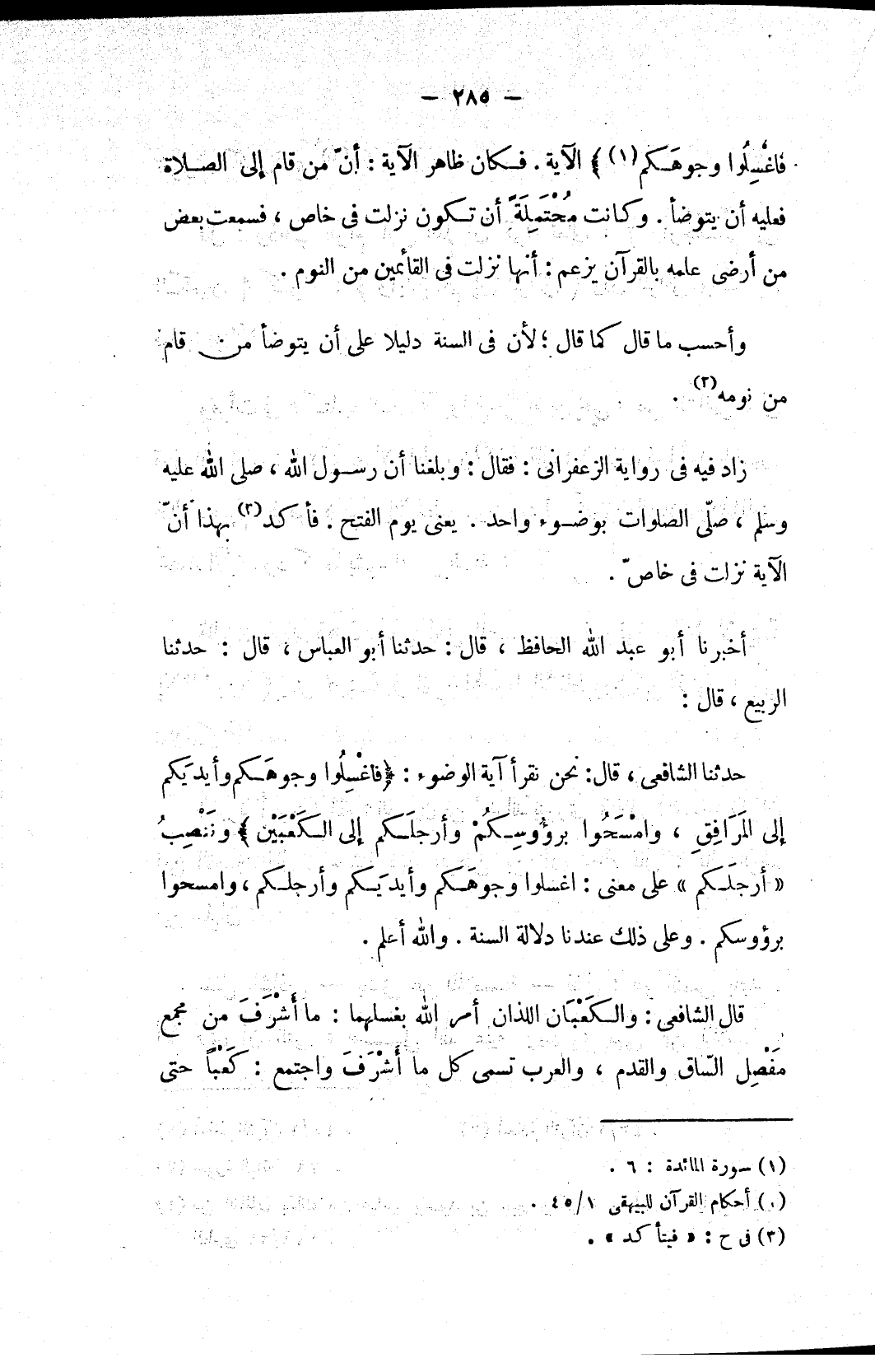 حدثنا الشافعي، قال: نحن نقرأ آية الوضوء: {فَاغْسِلُوا وُجُوهَكُمْ وَأَيْدِيَكُمْ إِلَى الْمَرَافِقِ وَامْسَحُوا بِرُءُوسِكُمْ وَأَرْجُلَكُمْ إِلَى الْكَعْبَيْنِ} ونَنْصِبُ «أرجلَكم» على معنى: اغسلوا وجوهَكم وأيديَكم وأرجلكم، وامسحوا برؤوسكم. وعلى ذلك عندنا دلالة السنة. والله أعلم.