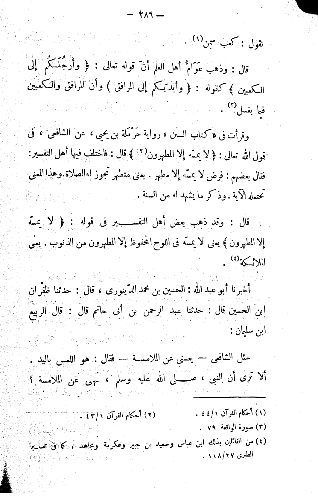 وقرأت في «كتاب السنن» رواية حَرْمَلة بن يحيى، عن الشافعي، في قول الله تعالى: {لَا يَمَسُّهُ إِلَّا الْمُطَهَّرُونَ (٣)} قال: فاختلف فيها أهل التفسير: فقال بعضهم: فرض لا يمسّه إلا مطهر. يعني متطهر تجوز له الصلاة. وهذا المعنى تحتمله الآية. وذكر ما يشهد له من السنة.