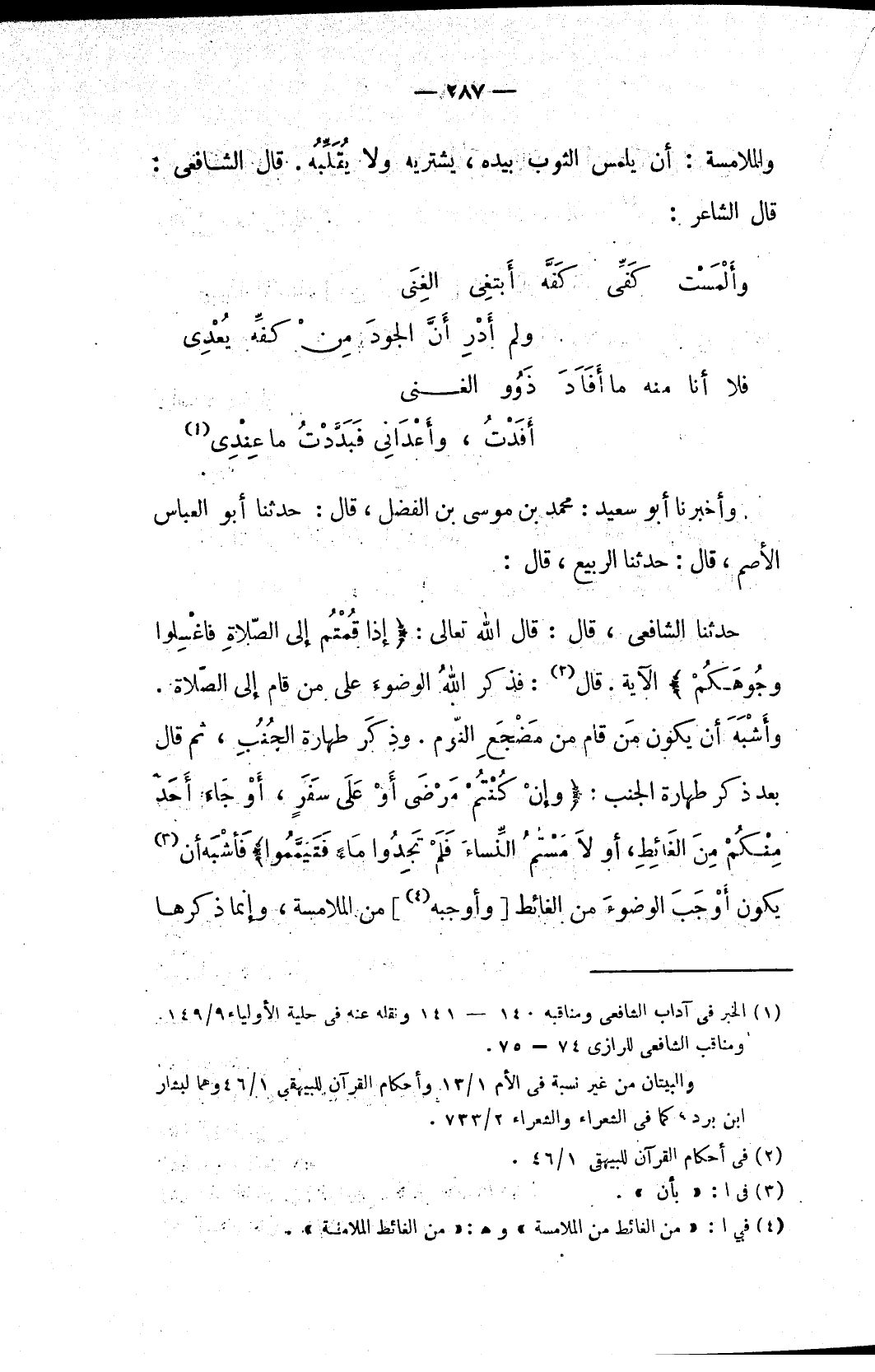 حدثنا الشافعي، قال: قال الله تعالى: {إِذَا قُمْتُمْ إِلَى الصَّلَاةِ فَاغْسِلُوا وُجُوهَكُمْ} الآية. قال (٢): فذكر اللهُ الوضوءَ على من قام إلى الصّلاة. وأَشْبَهَ أن يكون مَن قام من مَضْجَعِ النّوم. وذكَر طهارة الجنب: {وَإِنْ كُنْتُمْ مَرْضَى أَوْ عَلَى سَفَرٍ أَوْ جَاءَ أَحَدٌ مِنْكُمْ مِنَ الْغَائِطِ أَوْ لَامَسْتُمُ النِّسَاءَ فَلَمْ تَجِدُوا مَاءً فَتَيَمَّمُوا} فَأشْبَه أن (٣) يكون أَوْجَبَ الوضوءَ من الغائط [وأوجبه (٤)] من الملامسة، وإنما ذكرها