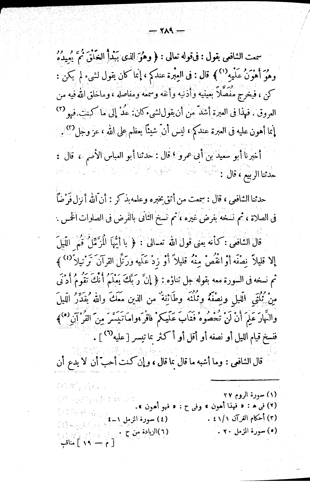 قال الشافعي: كأنه يعني قول الله تعالى: {يَا أَيُّهَا الْمُزَّمِّلُ • قُمِ اللَّيْلَ إِلَّا قَلِيلًا • نِصْفَهُ أَوِ انْقُصْ مِنْهُ قَلِيلًا • أَوْ زِدْ عَلَيْهِ وَرَتِّلِ الْقُرْآنَ تَرْتِيلًا (٤)} ثم نسخه في السورة معه بقوله جل ثناؤه: {إِنَّ رَبَّكَ يَعْلَمُ أَنَّكَ تَقُومُ أَدْنَى مِنْ ثُلُثَيِ اللَّيْلِ وَنِصْفَهُ وَثُلُثَهُ وَطَائِفَةٌ مِنَ الَّذِينَ مَعَكَ وَاللَّهُ يُقَدِّرُ اللَّيْلَ وَالنَّهَارَ عَلِمَ أَنْ لَنْ تُحْصُوهُ فَتَابَ عَلَيْكُمْ فَاقْرَءُوا مَا تَيَسَّرَ مِنَ الْقُرْآنِ (٥)} فنسخ قيام الليل أو نصفه أو أقل أو أكثر بما تيسر [عليه (٦)].