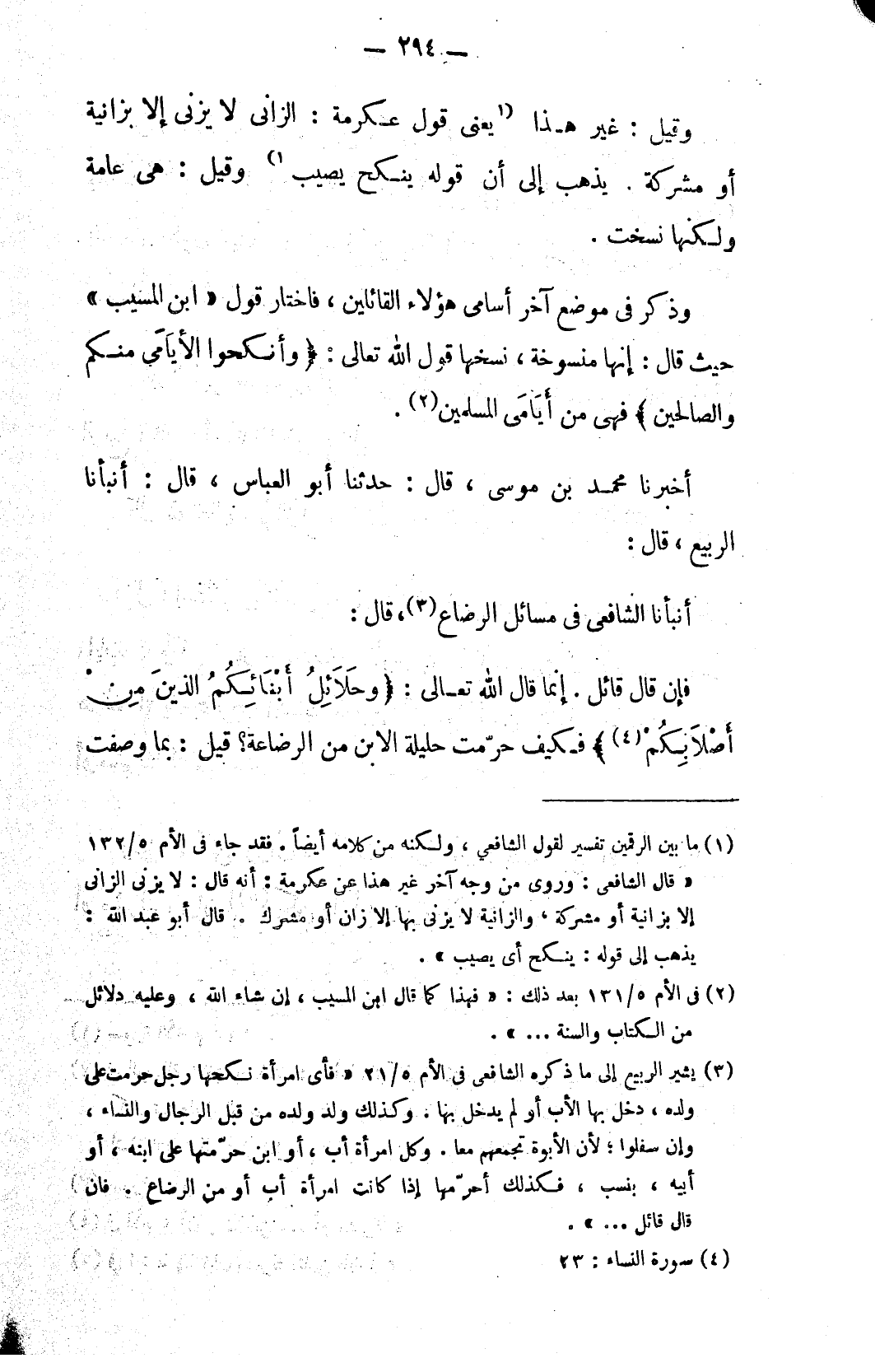 (٣) يشير الربيع إلى ما ذكره الشافعي في الأم ٥/ ٢١ «فأي امرأة نكحها رجل حرمت على ولده، دخل بها الأب أو لم يدخل بها. وكذلك ولد ولده من قبل الرجال والنساء، وإن سفلوا؛ لأن الأبوة تجمعهم معا. وكل امرأة أب، أو ابن حرّمتها على ابنه، أو أبيه، بنسب، فكذلك أحرّمها إذا كانت امرأة أب أو من الرضاع. فان قال قائل ...».