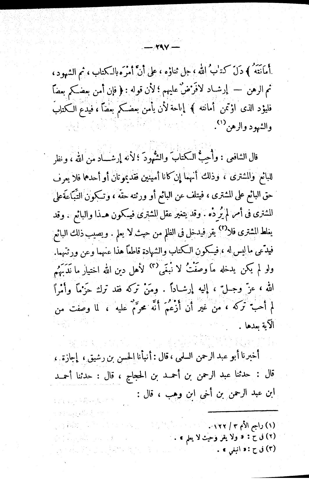 أَمَانَتَهُ} دَلّ كتابُ الله، جل ثناؤه، على أنَّ أمْرَه بالكتاب، ثم الشهود، ثم الرهن – إرشاد لا فَرْضٌ عليهم؛ لأن قوله: {فَإِنْ أَمِنَ بَعْضُكُمْ بَعْضًا فَلْيُؤَدِّ الَّذِي اؤْتُمِنَ أَمَانَتَهُ} إباحة لأن يأمن بعضكم بعضاً، فيدع الكتاب والشهود والرهن (١).