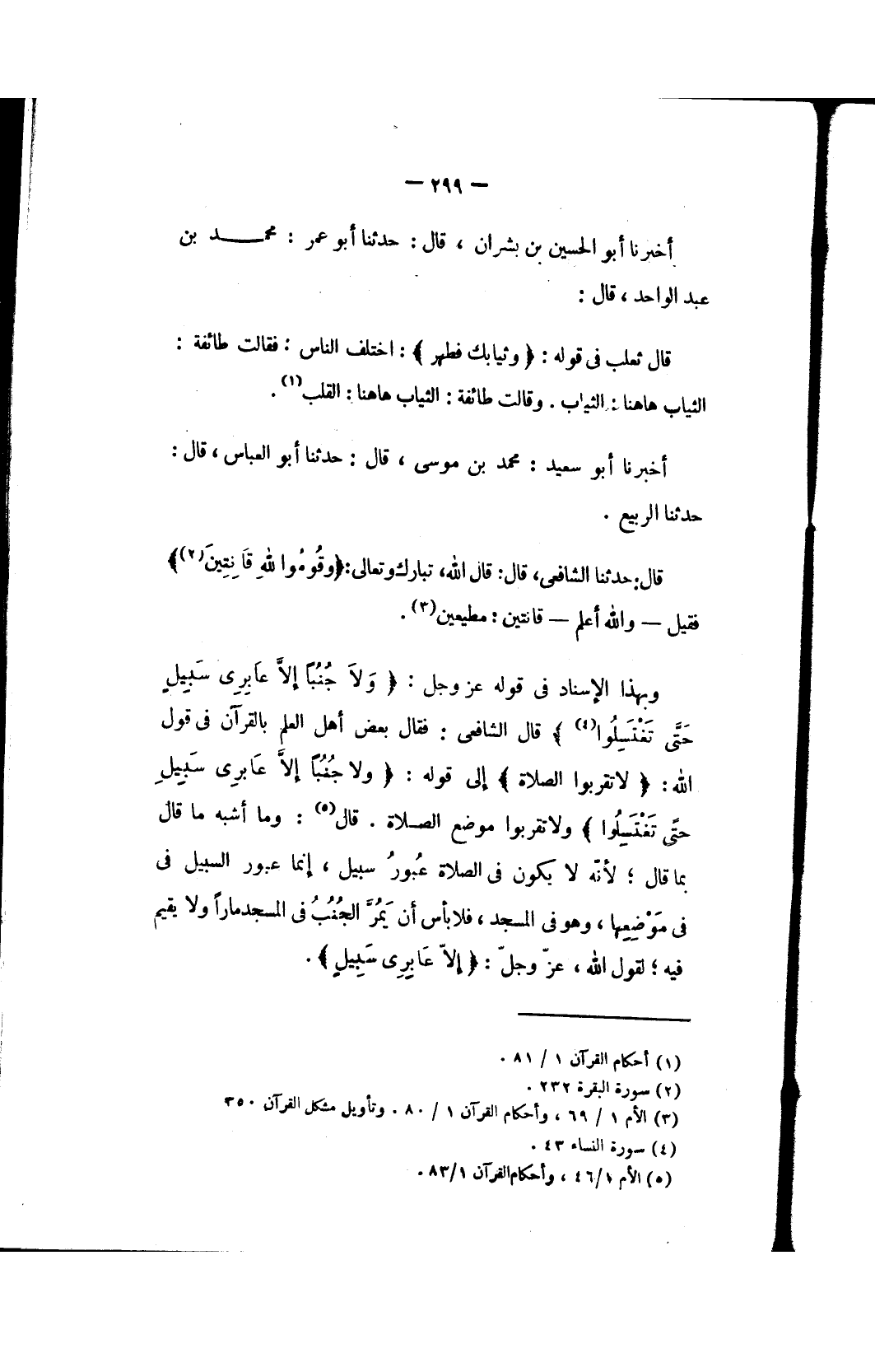 وبهذا الإسناد في قوله عز وجل: {وَلَا جُنُبًا إِلَّا عَابِرِي سَبِيلٍ حَتَّى تَغْتَسِلُوا (٤)} قال الشافعي: فقال بعض أهل العلم بالقرآن في قول الله: {لَا تَقْرَبُوا الصَّلَاةَ} إلى قوله: {وَلَا جُنُبًا إِلَّا عَابِرِي سَبِيلٍ حَتَّى تَغْتَسِلُوا} ولا تقربوا موضع الصلاة. قال (٥): وما أشبه ما قال بما قال؛ لأنّه لا يكون في الصلاة عُبورُ سبيل، إنما عبور السبيل في في مَوْضِعِها، وهو في المسجد، فلا بأس أن يَمُرَّ الجُنُبُ في المسجد ماراً ولا يقيم فيه؛ لقول الله، عزّ وجلّ: {إِلَّا عَابِرِي سَبِيلٍ}.