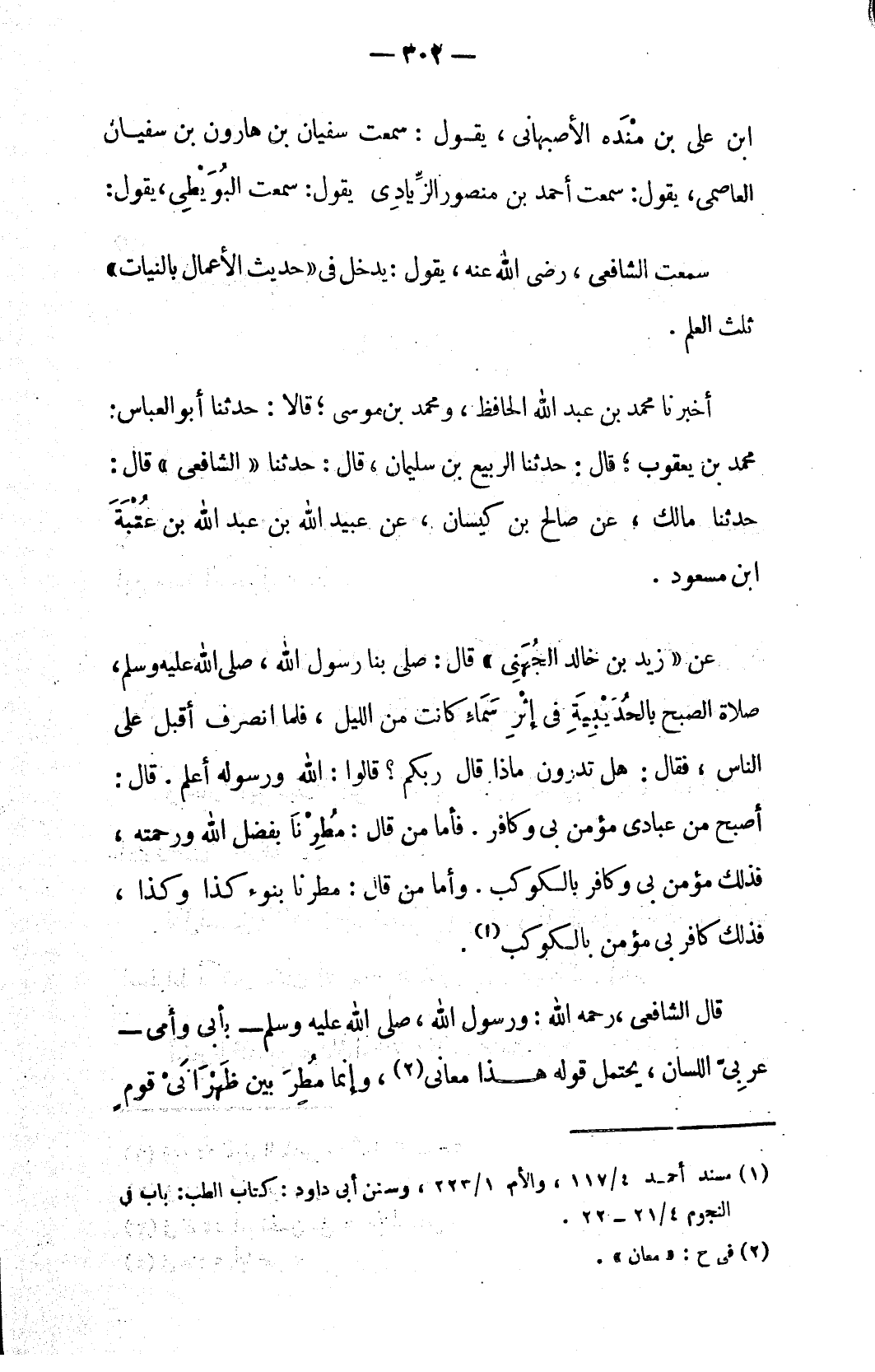 عن «زيد بن خالد الجُهَنِي» قال: صلى بنا رسول الله، صلى الله عليه وسلم، صلاة الصبح بالحُدَيْبِيَةِ في إثْرِ سَمَاءِ كانت من الليل، فلما انصرف أقبل علي الناس، فقال: هل تدرون ماذا قال ربكم؟ قالوا: الله ورسوله أعلم. قال: أصبح من عبادي مؤمن بي وكافر. فأما من قال: مُطِرْنَا بفضل الله ورحمته، فذلك مؤمن بي وكافر بالكوكب. وأما من قال: مطرنا بنوء كذا وكذا، فذلك كافر بي مؤمن بالكوكب (١).