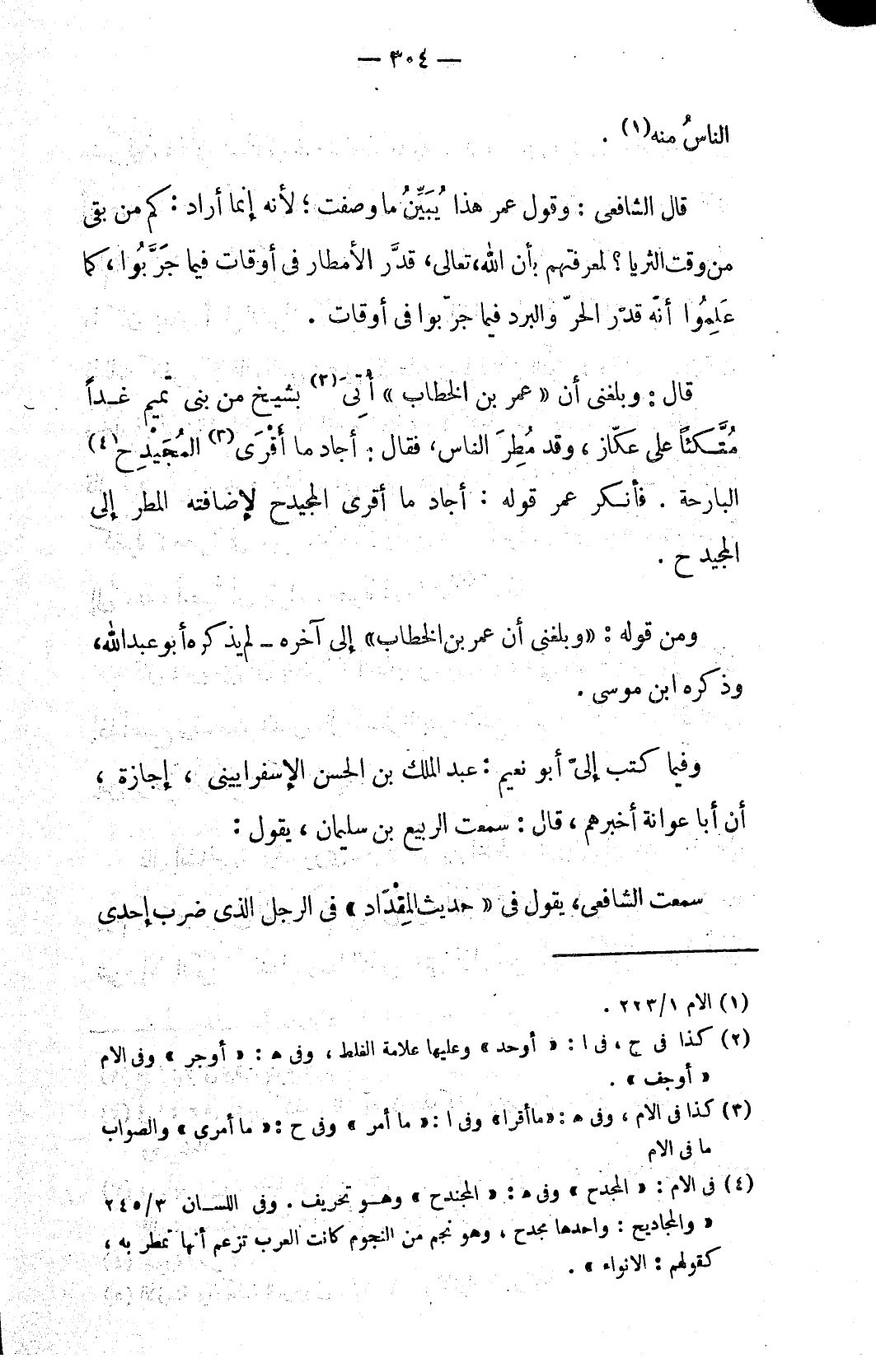قال الشافعي: وقول عمر هذا يُبَيِّنُ ما وصفت؛ لأنه إنما أراد: كم من بقى من وقت الثريا؟ لمعرفتهم بأن الله تعالى، قدَّر الأمطار في أوقات فيما جَرَّبُوا، كما عَلِمُوا أنّه قدّر الحرّ والبرد فيما جرّبوا في أوقات.