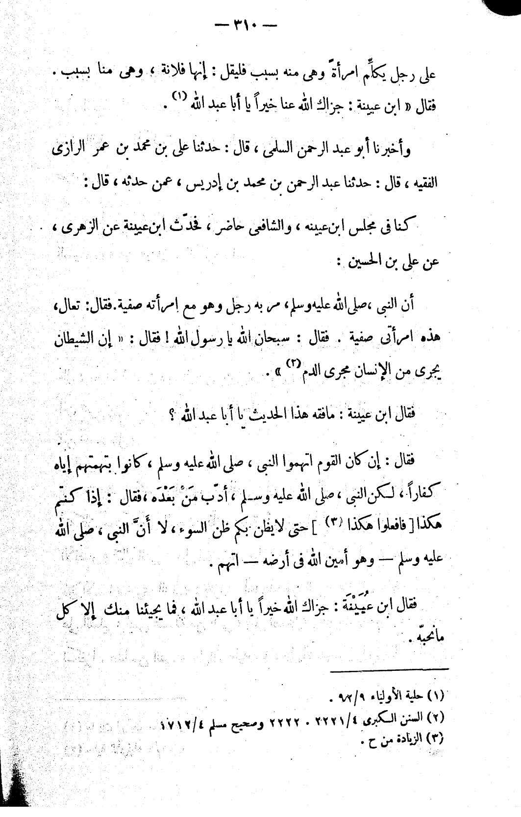 أن النبي، صلى الله عليه وسلم، مر به رجل وهو مع امرأته صفية. فقال: تعال، هذه امرأتي صفية. فقال: سبحان الله يا رسول الله! فقال: «إن الشيطان يجري من الإنسان مجرى الدم (٢)».