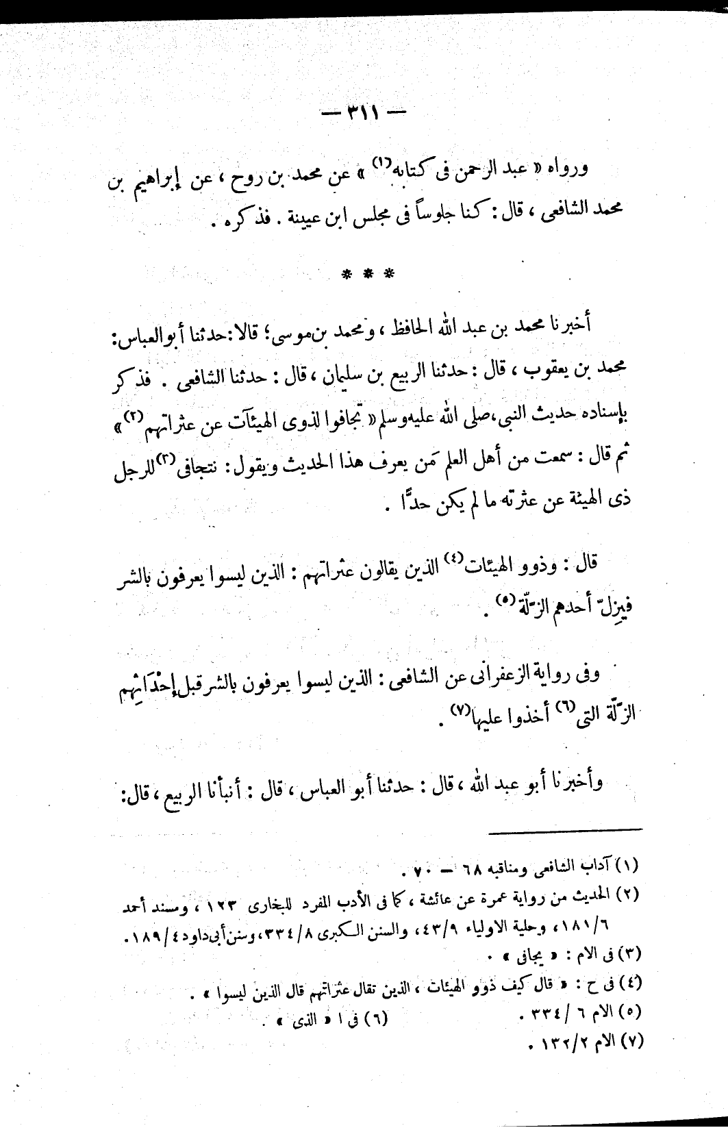 أخبرنا محمد بن عبد الله الحافظ، ومحمد بن موسى؛ قالا: حدثنا أبو العباس: محمد بن يعقوب، قال: حدثنا الربيع بن سليمان، قال: حدثنا الشافعي. فذكر بإسناده حديث النبي، صلى الله عليه وسلم «تجافوا لذوي الهيئآت عن عثراتهم (٢)» ثم قال: سمعت من أهل العلم مَن يعرف هذا الحديث ويقول: نتجافى (٣) للرجل ذي الهيئة عن عثرته ما لم يكن حدًّا.