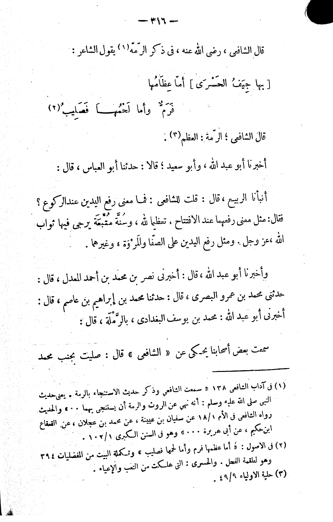 (١) في آداب الشافعي ١٣٨ «سمعت الشافعي وذكر حديث الاستنجاء بالرمة. يعني حديث النبي صلى الله عليه وسلم: أنه نهى عن الروث والرمة أن يستنجى بهما. .» والحديث رواه الشافعي في الام ١/ ١٨ عن سفيان بن عيينة، عن محمد بن عجلان، عن القعقاع ابن حكيم، عن أبي هريرة ...» وهو في السنن الكبرى ١/ ١٠٢.