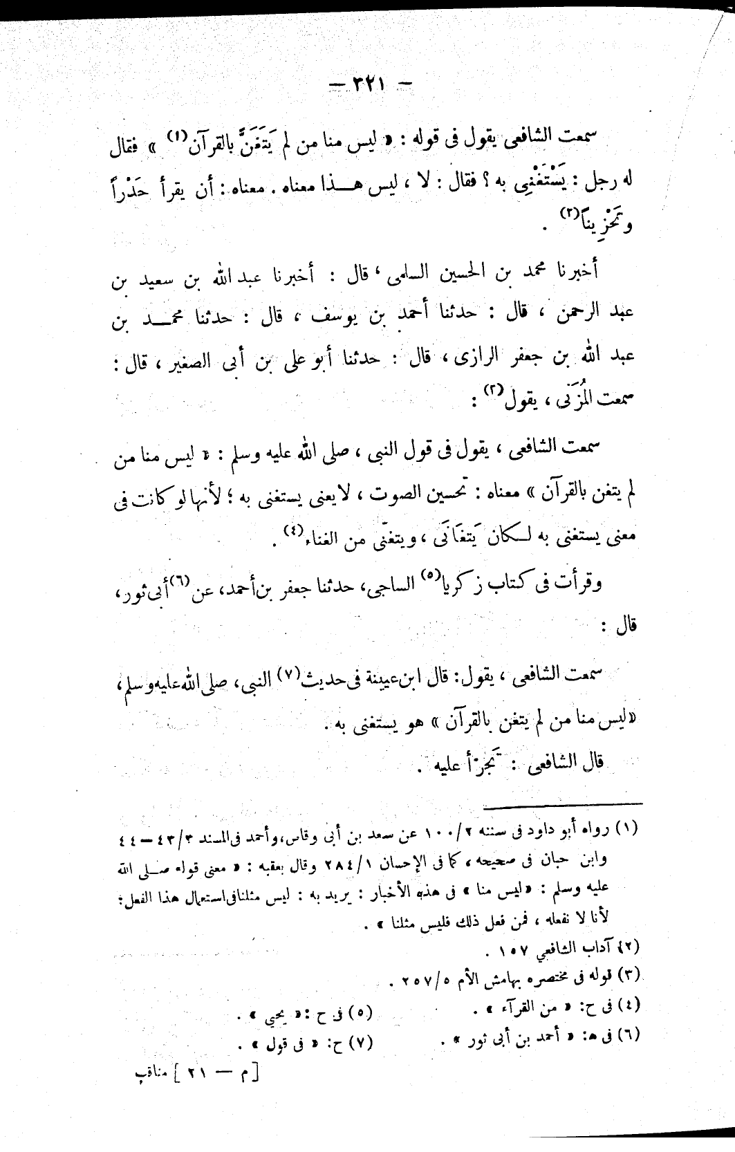 سمعت الشافعي، يقول: قال ابن عيينة في حديث (٧) النبي، صلى الله عليه وسلم، «ليس منا من لم يتغن بالقرآن» هو يستغنى به.