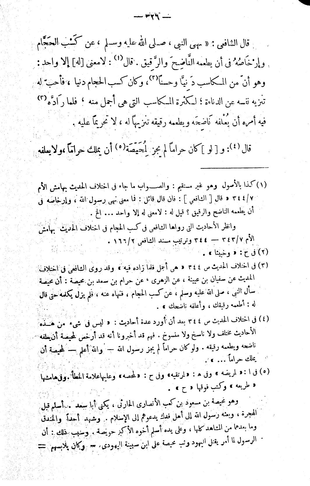(٣) في اختلاف الحديث ص ٣٤٤ «هي أجمل فلما زاده فيه» وقد روى الشافعي في اختلاف الحديث عن سفيان بن عيينة، عن الزهري، عن حرام بن سعد بن محيصة: أن محيصة سأل النبي، صلى الله عليه وسلم، عن كسب الحجام، فنهاه عنه، فلم يزل يكلمه حتى قال له: أطعمه رقيقك، وأعلفه ناضحك».