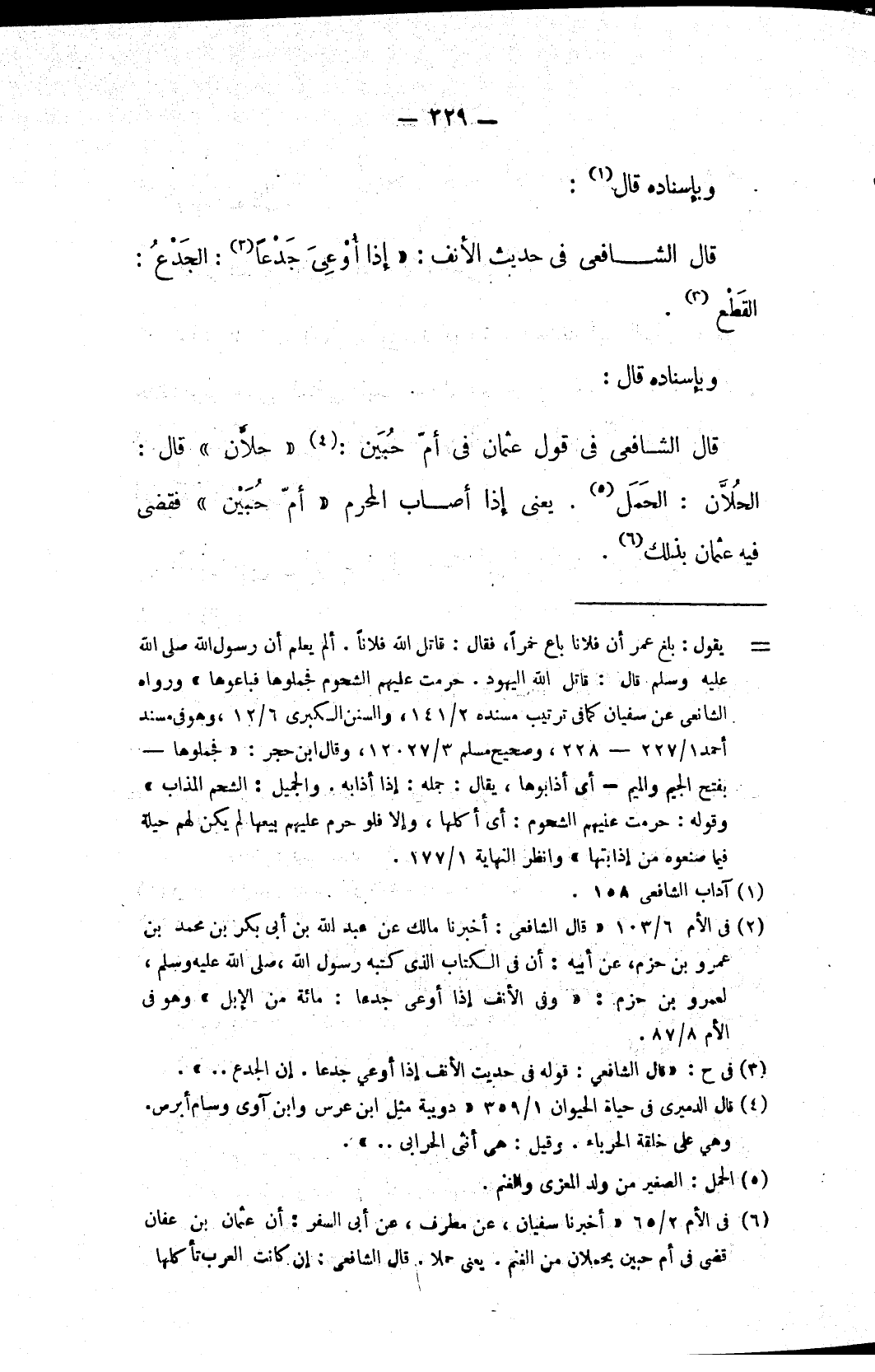 قال الشافعي في قول عثمان في أمّ حُبَين: (٤) «حلاَّن» قال: الحُلاَّن: الحَمَل (٥). يعني إذا أصاب المحرم «أمّ حُبَيْن» فقضى فيه عثمان بذلك (٦).