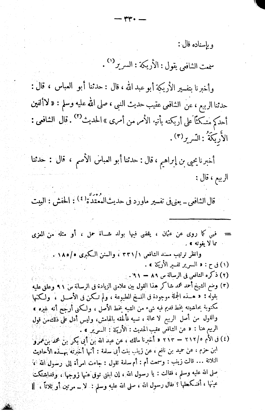 (٣) وضع الشيخ أحمد محمد شاكر هذا القول بين علامتي الزيادة في الرسالة ص ٩١ وعلق عليه بقوله: «هذه الجملة موجودة في النسخ المطبوعة، ولم تكن في الأصل، ولكنها مكتوبة بحاشيته بخط قديم فيه شيء من الشبه بخط الأصل، ولكني أرجح أنه غيره» والقول من أصل الربيع لا محالة، نسيه فألحقه بالهامش، وليس أدل على ذلك من قول الربيع هنا: «عن الشافعي عقيب الحديث: الأريكة: السرير».
