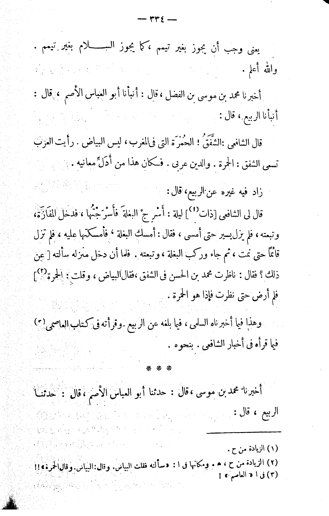 قال لي الشافعي [ذات (١)] ليلة: أَسْرَجْ البغلةَ فأَسْرَجْتُها، فدخل المفَازَة، وتبعته، فلم يزل يسير حتى أمسى، فقال: أمسك البغلة، فأمسكتها عليه، فلم يزل قائماً حتى نمت، ثم جاء وركب البغلة، وتبعته. فلما أن دخل منزله سألته [عن ذلك؟ فقال: ناظرت محمد بن الحسن في الشفق، فقال البياض، قلت: الحمرة (٢)] فلم أرض حتى نظرت فإذا هو الحمرة.