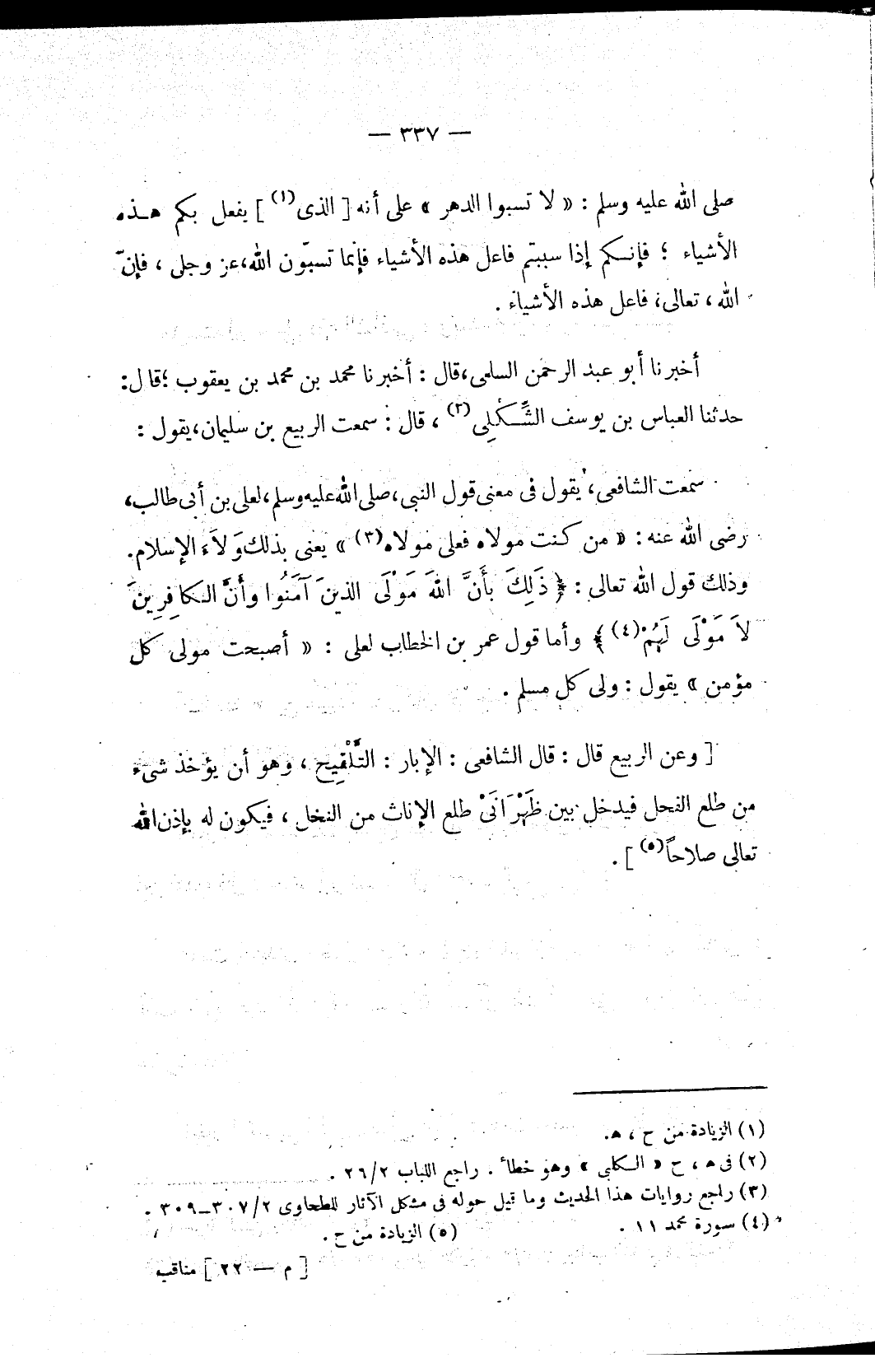 سمعت الشافعي، يقول في معنى قول النبي، صلى الله عليه وسلم، لعلي بن أبي طالب، رضي الله عنه: «من كنت مولاه فعلى مولاه (٣)» يعني بذلك وَلاَءَ الإِسلام. وذلك قول الله تعالى: {ذَلِكَ بِأَنَّ اللَّهَ مَوْلَى الَّذِينَ آمَنُوا وَأَنَّ الْكَافِرِينَ لَا مَوْلَى لَهُمْ (٤)} وأما قول عمر بن الخطاب لعلي: «أصبحت مولى كل مؤمن» يقول: ولى كل مسلم.