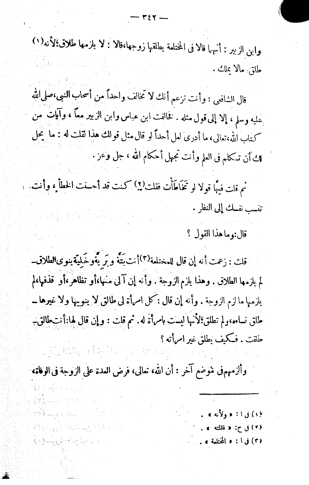قال الشافعي: وأنت تزعم أنك لا تخالف واحداً من أصحاب النبي، صلى الله عليه وسلم، إلا إلى قول مثله. فخالفت ابن عباس وابن الزبير معاً، وآيات من كتاب الله، تعالى، ما أدرى لعل أحداً لو قال مثل قولك هذا لقلت له: ما يحل لك أن تكلم في العلم وأنت تجهل أحكام الله، جل وعز.