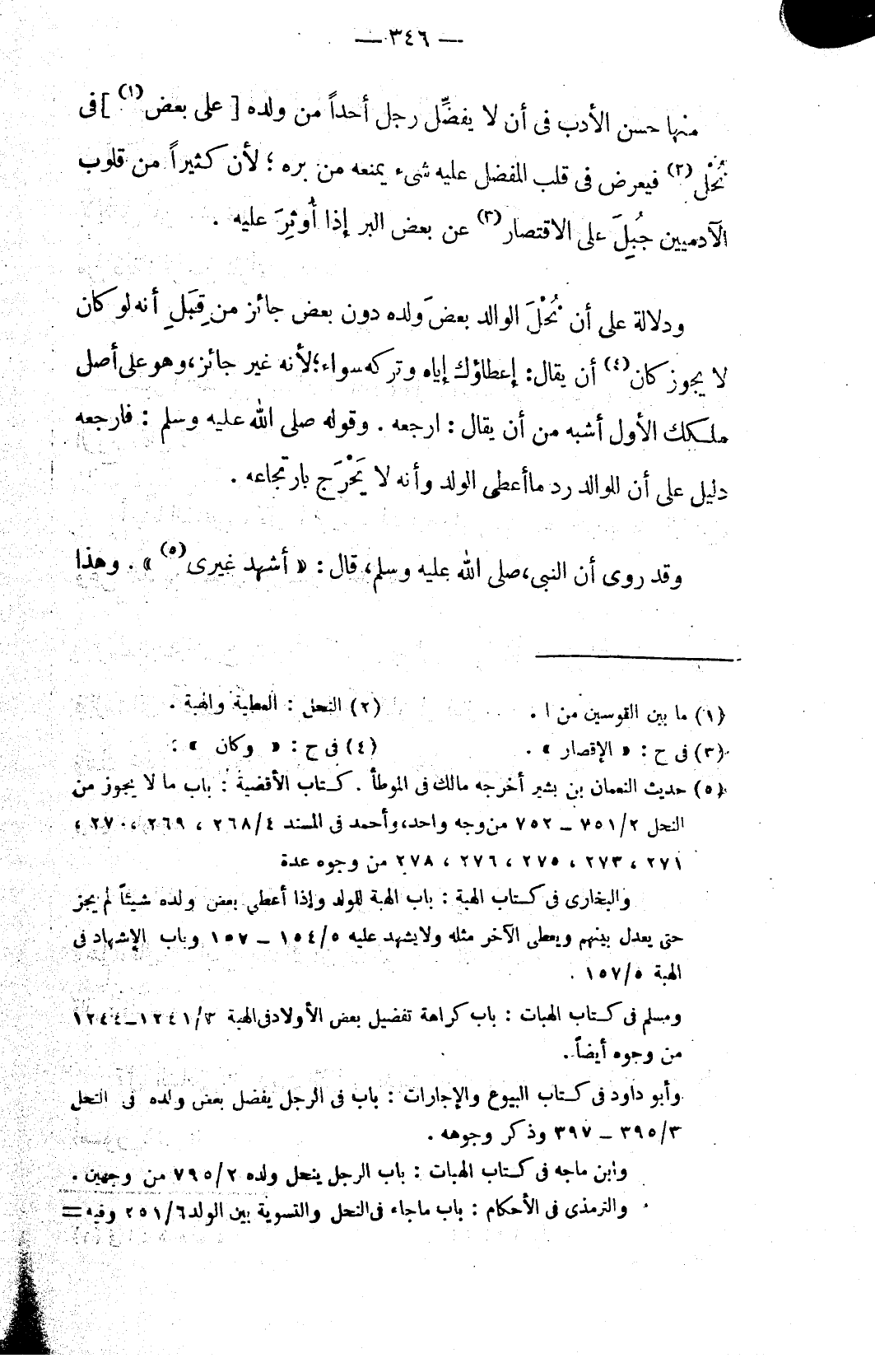 منها حسن الأدب في أن لا يفضِّل رجل أحداً من ولده [على بعض (١)] في نُحْل (٢) فيعرض في قلب المفضل عليه شيء يمنعه من بره؛ لأن كثيراً من قلوب الآدميين جُبِلَ على الاقتصار (٣) عن بعض البر إذا أُوثِرَ عليه.