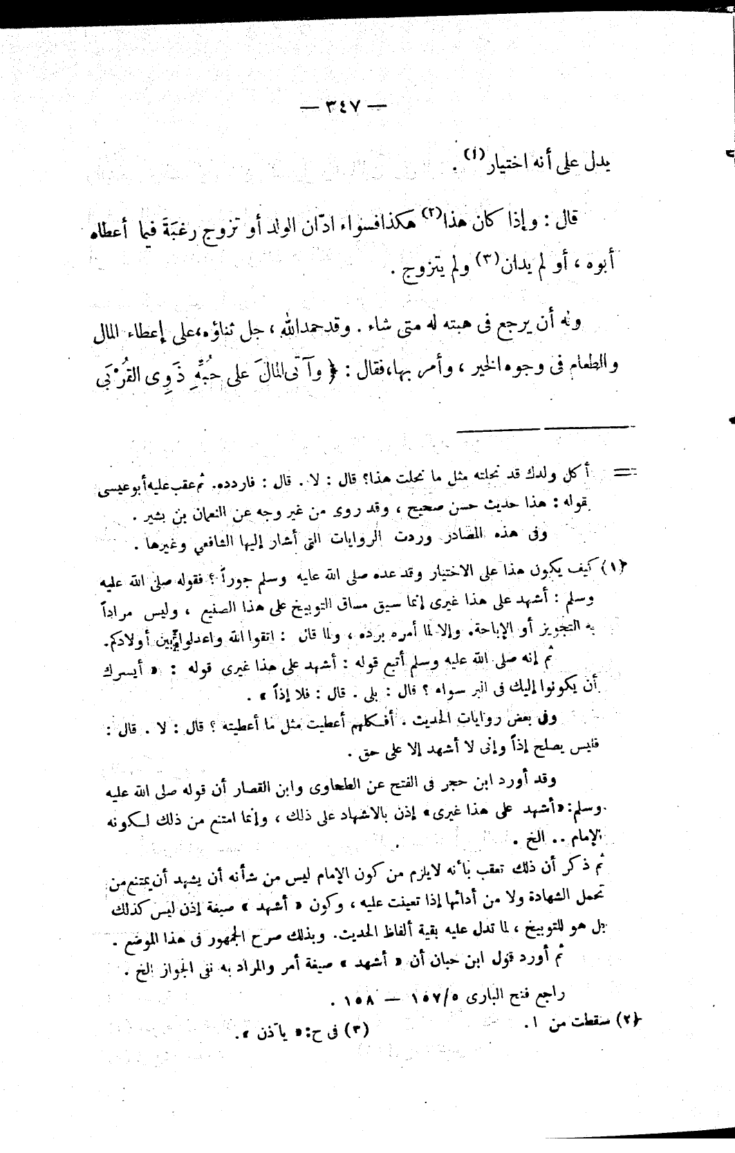 وقد أورد ابن حجر في الفتح عن الطحاوي وابن القصار أن قوله صلى الله عليه وسلم: «أشهد على هذا غيري» إذن بالاشهاد على ذلك، وإنما امتنع من ذلك لكونه الإمام .. الخ.