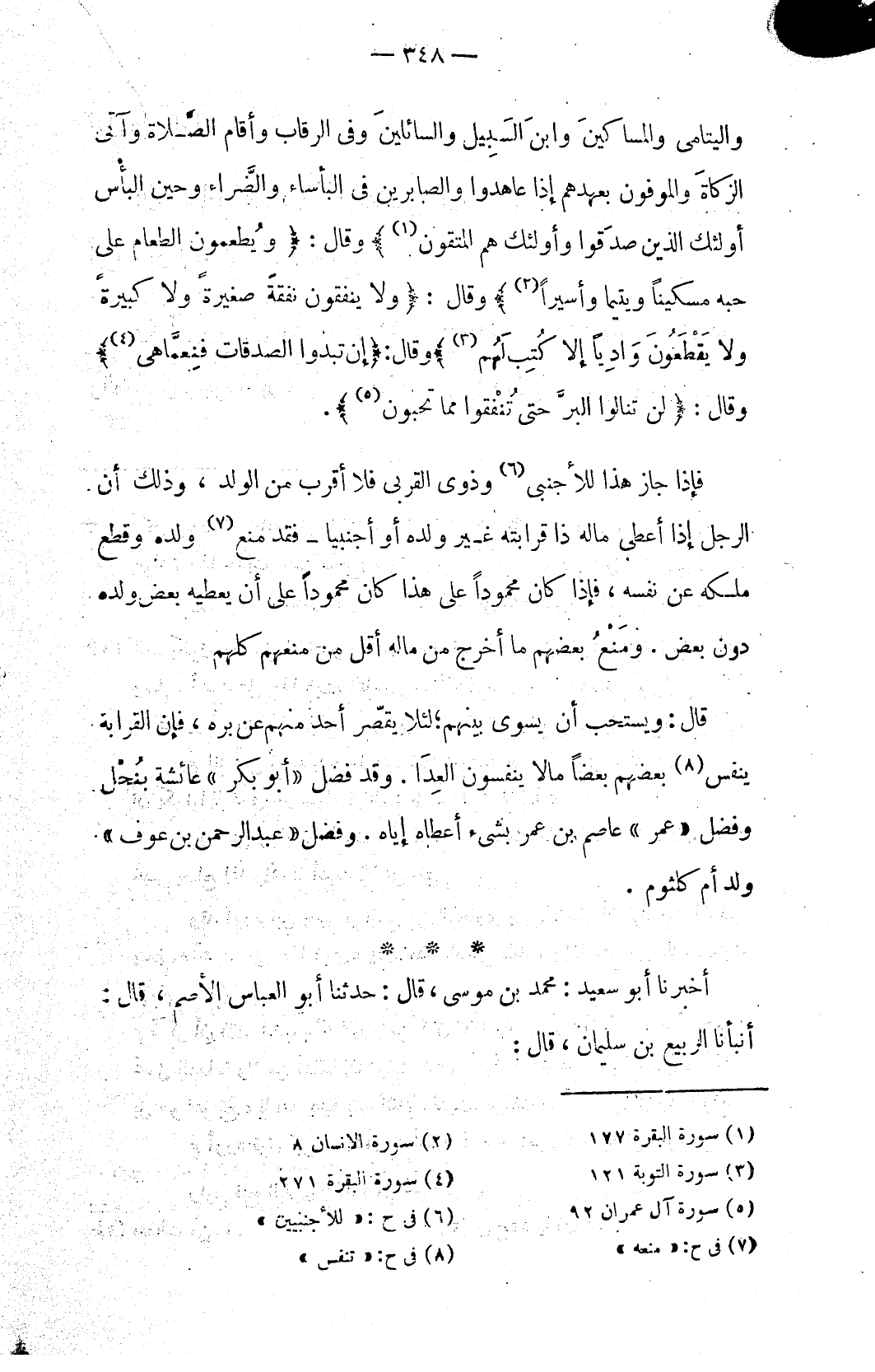 وَالْيَتَامَى وَالْمَسَاكِينَ وَابْنَ السَّبِيلِ وَالسَّائِلِينَ وَفِي الرِّقَابِ وَأَقَامَ الصَّلَاةَ وَآتَى الزَّكَاةَ وَالْمُوفُونَ بِعَهْدِهِمْ إِذَا عَاهَدُوا وَالصَّابِرِينَ فِي الْبَاسَاءِ وَالضَّرَّاءِ وَحِينَ الْبَاسِ أُولَئِكَ الَّذِينَ صَدَقُوا وَأُولَئِكَ هُمُ الْمُتَّقُونَ (١)} وقال: {وَيُطْعِمُونَ الطَّعَامَ عَلَى حُبِّهِ مِسْكِينًا وَيَتِيمًا وَأَسِيرًا (٢)} وقال: {وَلَا يُنْفِقُونَ نَفَقَةً صَغِيرَةً وَلَا كَبِيرَةً وَلَا يَقْطَعُونَ وَادِيًا إِلَّا كُتِبَ لَهُمْ (٣)} وقال: {إِنْ تُبْدُوا الصَّدَقَاتِ فَنِعِمَّا هِيَ (٤)} وقال: {لَنْ تَنَالُوا الْبِرَّ حَتَّى تُنْفِقُوا مِمَّا تُحِبُّونَ (٥)}.