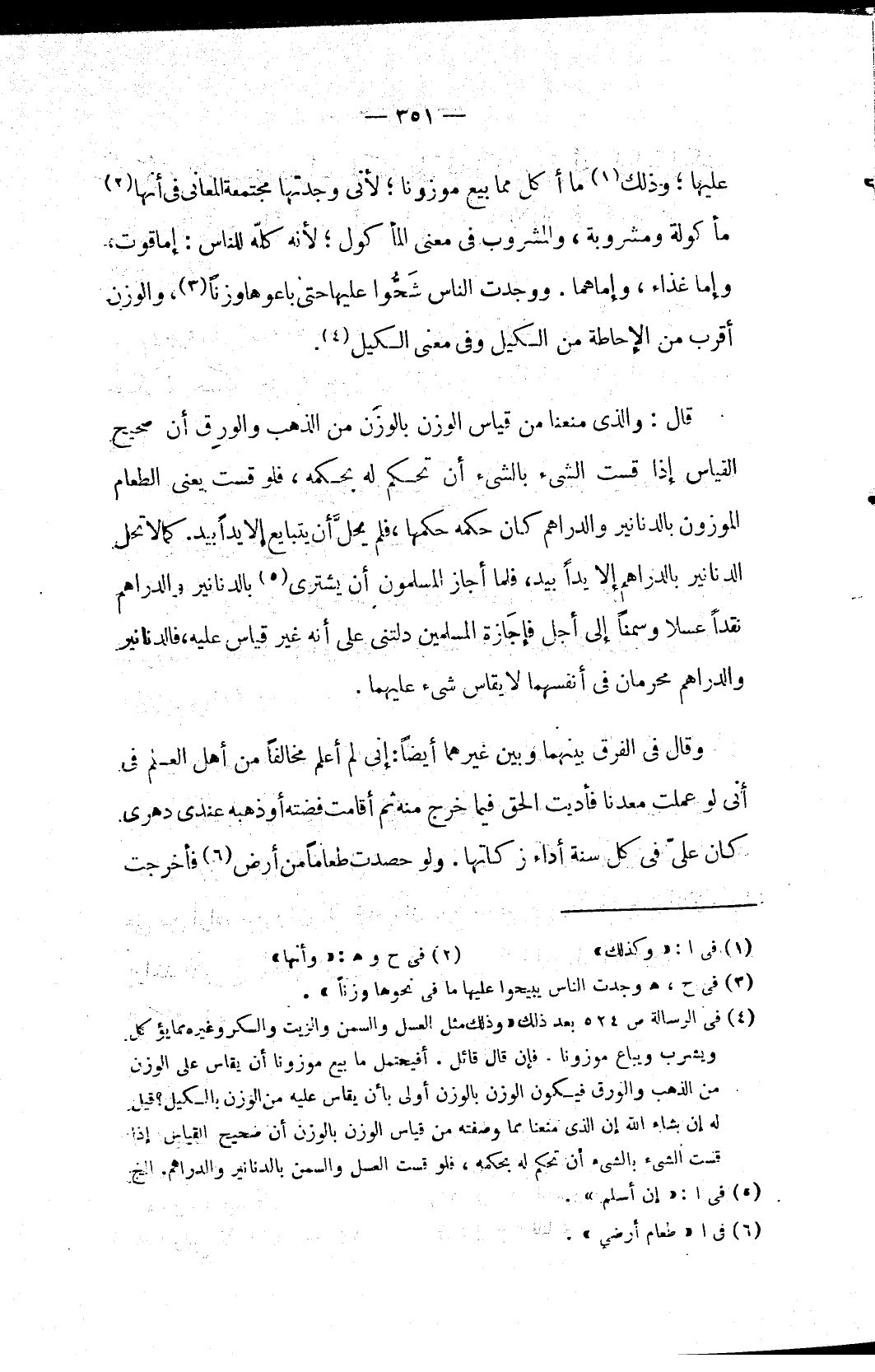 قال: والذي منعنا من القياس الوزن بالوَزن من الذهب والورِق أن صحيح القياس إذا قست الشيء بالشيء أن تحكم له بحكمه، فلو قست يعني الطعام الموزون بالدنانير والدراهم كان حكمه حكمها، فلم يحلَّ أن يتبايع إلا يداً بيد. كما لا تحل الدنانير بالدراهم إلا يداً بيد، فلما أجاز المسلمون أن يشتري (٥) بالدنانير والدراهم نقداً عسلا وسمناً إلى أجل فإجَازة المسلمين دلتني على أنه غير قياس عليه، فالدنانير والدراهم محرمان في أنفسهما لا يقاس شيء عليهما.