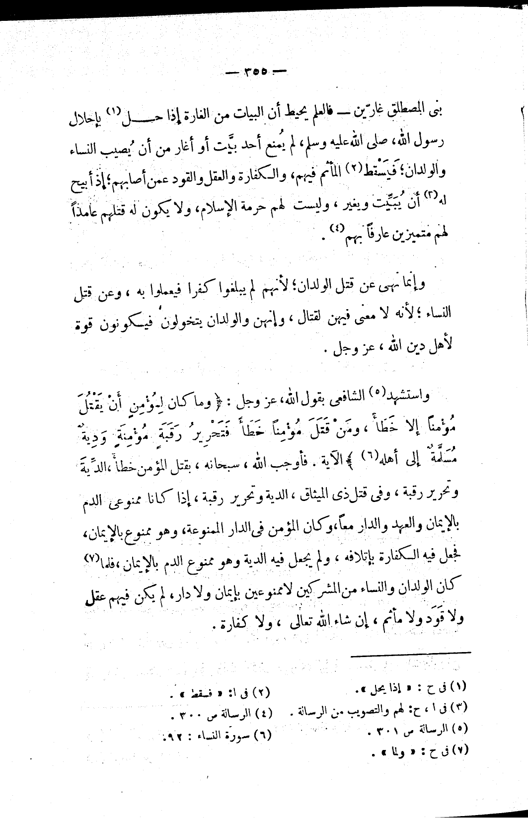 واستشهد (٥) الشافعي بقول الله، عز وجل: {وَمَا كَانَ لِمُؤْمِنٍ أَنْ يَقْتُلَ مُؤْمِنًا إِلَّا خَطَأً وَمَنْ قَتَلَ مُؤْمِنًا خَطَأً فَتَحْرِيرُ رَقَبَةٍ مُؤْمِنَةٍ وَدِيَةٌ مُسَلَّمَةٌ إِلَى أَهْلِهِ (٦)} الآية. فأوجب الله، سبحانه، بقتل المؤمن خطأَ، الدِّيةَ وتحرير رقبة، وفي قتل ذي الميثاق، الدية وتحرير رقبة، إذا كانا ممنوعي الدم بالإيمان والعهد والدار معاً، وكان المؤمن في الدار الممنوعة، وهو ممنوع بالإيمان، فجعل فيه الكفارة بإتلافه، ولم يجعل فيه الدية وهو ممنوع الدم بالإيمان، فلما (٧) كان الولدان والنساء من المشركين لا ممنوعين بإيمان ولا دار، لم يكن فيهم عقل ولا قَوَد ولا مأثم، إن شاء الله تعالى، ولا كفارة.