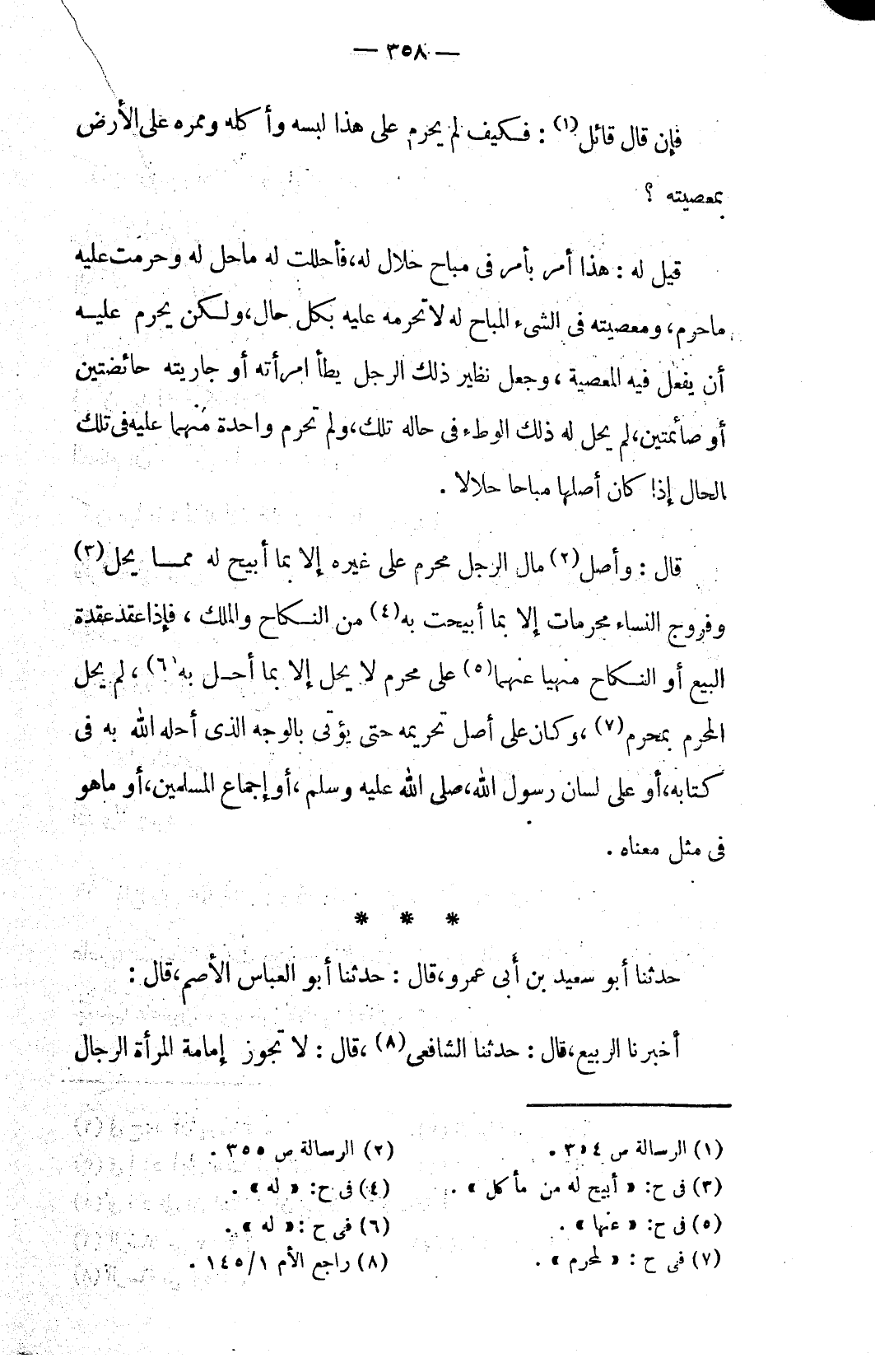 قال: وأصل (٢) مال الرجل محرم على غيره إلا بما أبيح له مما يحل (٣) وفروج النساء محرمات إلا بما أبيحت به (٤) من النكاح والملك، فإذا عقد عقدة البيع أو النكاح منهيا عنهما (٥) على محرم لا يحل إلا بما أحل به (٦)، لم يحل المحرم بمحرم (٧)، وكان على أصل تحريمه حتى يؤتى بالوجه الذي أحله الله به في كتابه، أو على لسان رسول الله، صلى الله عليه وسلم، أو إجماع المسلمين، أو ما هو في مثل معناه.
