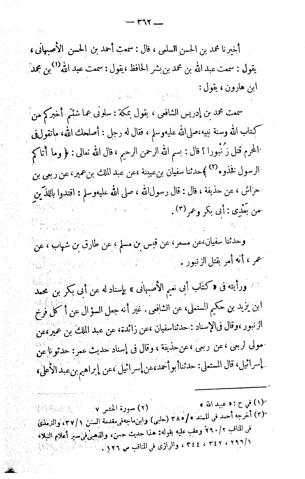 سمعت محمد بن إدريس الشافعي، يقول بمكة: سلوني عما شئتم أخبركم من كتاب الله وسنة نبيه، صلى الله عليه وسلم، فقال له رجل: أصلحك الله، ما تقول في المحرم قتل زُنْبورا؟ قال: بسم الله الرحمن الرحيم، قال الله تعالى: {وَمَا آتَاكُمُ الرَّسُولُ فَخُذُوهُ (٢)} حدثنا سفيان بن عيينة، عن عبد الملك بن عمير، عن ربعى بن حراش، عن حذيفة، قال: قال رسول الله، صلى الله عليه وسلم: اقتدوا باللذَينِ من بَعْدِي: أبي بكر وعمر (٣).