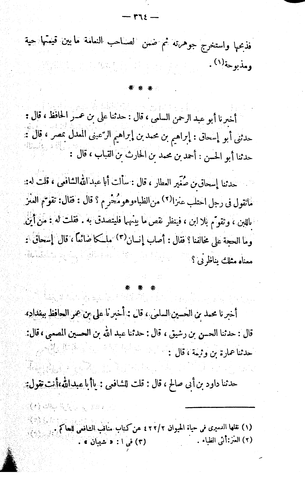 حدثنا إسحاق بن صُغَير العطار، قال: سألت أبا عبد الله الشافعي، قلت له: ما تقول في رجل احتلب عنزا (٢) من الظباء وهو مُحْرِم؟ قال: فقال: تقوّم العنز باللبن، وتقوّم بلا لبن، فينظر نقص ما بينهما فليتصدق به. فقلت له: من أين وما الحجة على مخالفنا؟ فقال: أصاب إنسان (٣) ملكا ضائعاً، قال إسحاق: معناه مثلك يناظرني؟