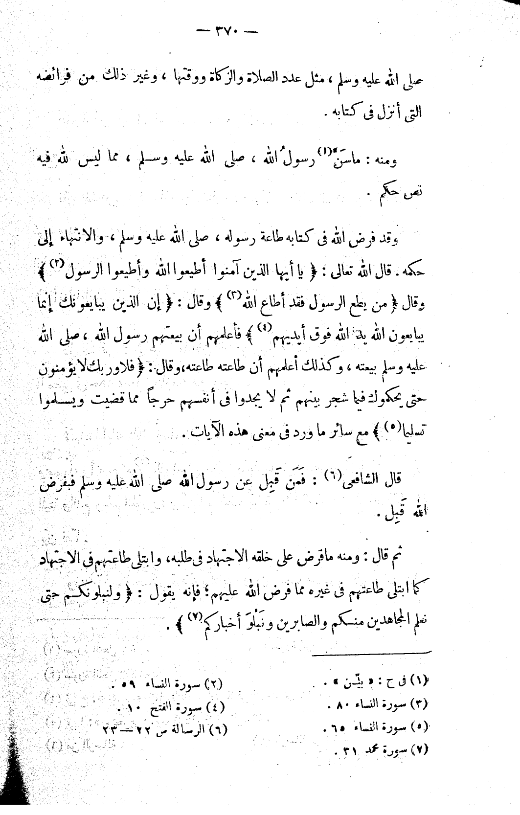 وقد فرض الله في كتابه طاعة رسوله، صلى الله عليه وسلم، والانتهاء إلى حكمه. قال الله تعالى {يَا أَيُّهَا الَّذِينَ آمَنُوا أَطِيعُوا اللَّهَ وَأَطِيعُوا الرَّسُولَ (٢)} وقال: {مَنْ يُطِعِ الرَّسُولَ فَقَدْ أَطَاعَ اللَّهَ (٣)} وقال: {إِنَّ الَّذِينَ يُبَايِعُونَكَ إِنَّمَا يُبَايِعُونَ اللَّهَ يَدُ اللَّهِ فَوْقَ أَيْدِيهِمْ (٤)} فأعلمهم أن بيعتهم رسول الله، صلى الله عليه وسلم بيعته، وكذلك أعلمهم أن طاعته طاعته، وقال: {فَلَا وَرَبِّكَ لَا يُؤْمِنُونَ حَتَّى يُحَكِّمُوكَ فِيمَا شَجَرَ بَيْنَهُمْ ثُمَّ لَا يَجِدُوا فِي أَنْفُسِهِمْ حَرَجًا مِمَّا قَضَيْتَ وَيُسَلِّمُوا تَسْلِيمًا (٥)} مع سائر ما ورد في معنى هذه الآيات.