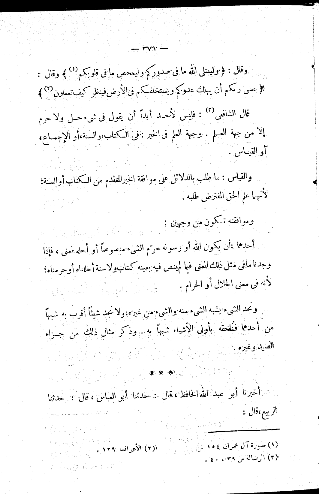 قال الشافعي (٣): فليس لأحد أبداً أن يقول في شيء حل ولا حرم إلا من جهة العلم. وجهة العلم الخبر: في الكتاب، والسنة، أو الإجماع، أو القياس.