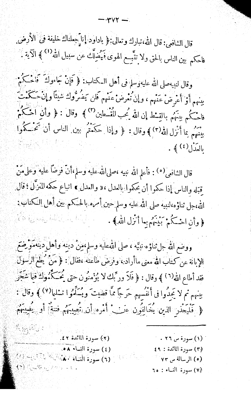 قال الشافعي (٥): فأعلم الله نبيه، صلى الله عليه وسلم، أنّ فرضاً عليه وعلى مَنْ قِبَله والناس إذا حكموا أن يحكموا بالعدل، «والعدل» اتباع حكمه المنزَّل؛ قال الله، جل ثناؤه، لنبيه صلى الله عليه وسلم حين أمره بالحكم بين أهل الكتاب: {وَأَنِ احْكُمْ بَيْنَهُمْ بِمَا أَنْزَلَ اللَّهُ}.