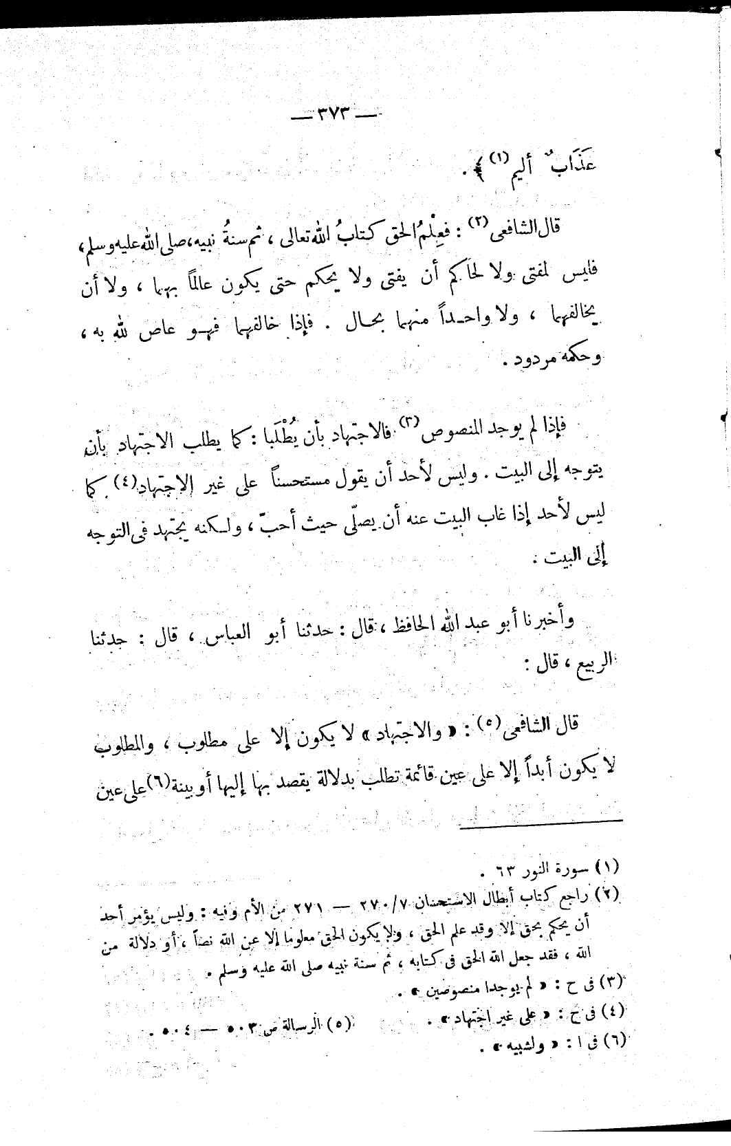 قال الشافعي (٥): «والاجتهاد» لا يكون إلا على مطلوب، والمطلوب لا يكون أبداً إلا على عين قائمة تطلب بدلالة يقصد بها إليها أو بينة (٦) على عين