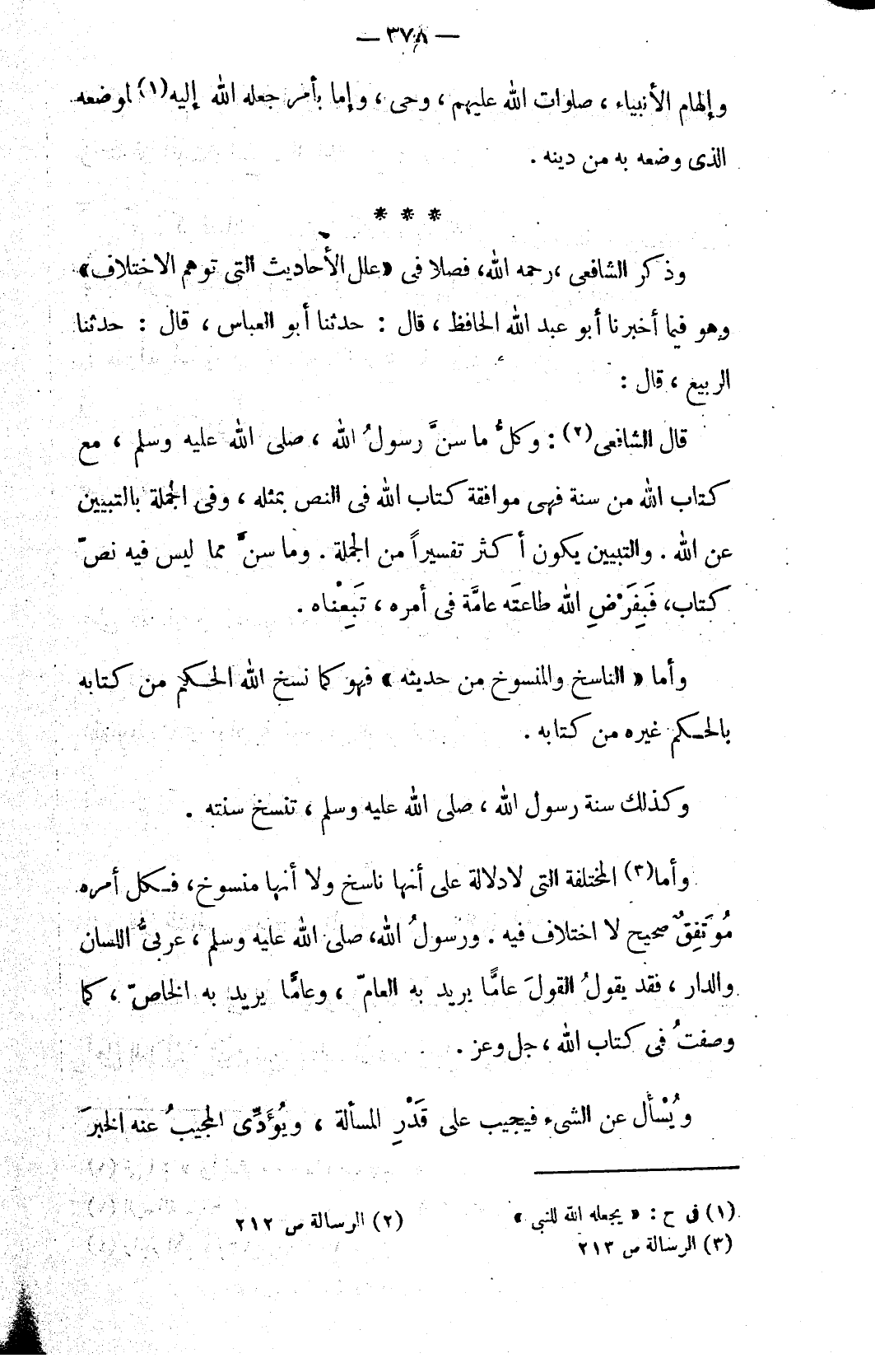 وأما (٣) المختلفة التي لا دلالة على أنها ناسخ ولا أنها منسوخ، فكل أمره مُوتَفِقٌ صحيح لا اختلاف فيه. ورسولُ الله، صلى الله عليه وسلم، عربيُّ اللسان والدار، فقد يقولُ القولَ عامًّا يريد به العام، وعامًّا يريد به الخاصّ، كما وصفتُ في كتاب الله، جل وعز.