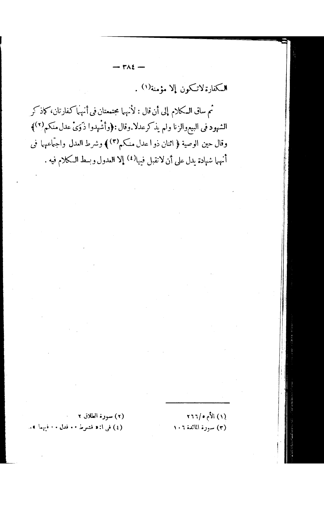 ثم ساق الكلام إلى أن قال: لأنهما مجتمعتان في أنهما كفارتان، كما ذكر الشهود في البيع والزنا ولم يذكر عدلا. وقال: {وَأَشْهِدُوا ذَوَيْ عَدْلٍ مِنْكُمْ (٢)} وقال حين الوصية {اثْنَانِ ذَوَا عَدْلٍ مِنْكُمْ (٣)} وشرط العدل واجتماعهما في أنهما شهادة يدل على أن لا تقبل فيها (٤) إلا العدول وبسط الكلام فيه.
